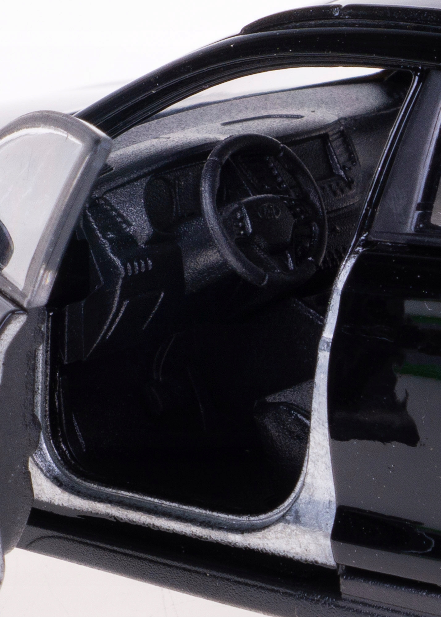 Model wykonany jest z metalu z dodatkiem plastiku. Posiada otwierane drzwi oraz gumowe opony.
