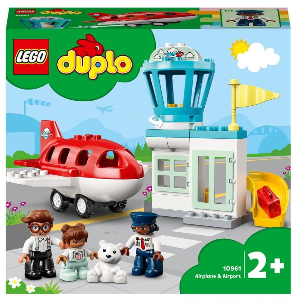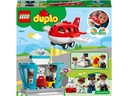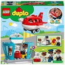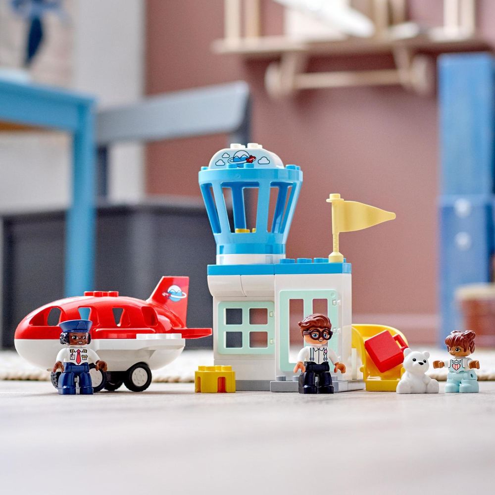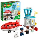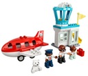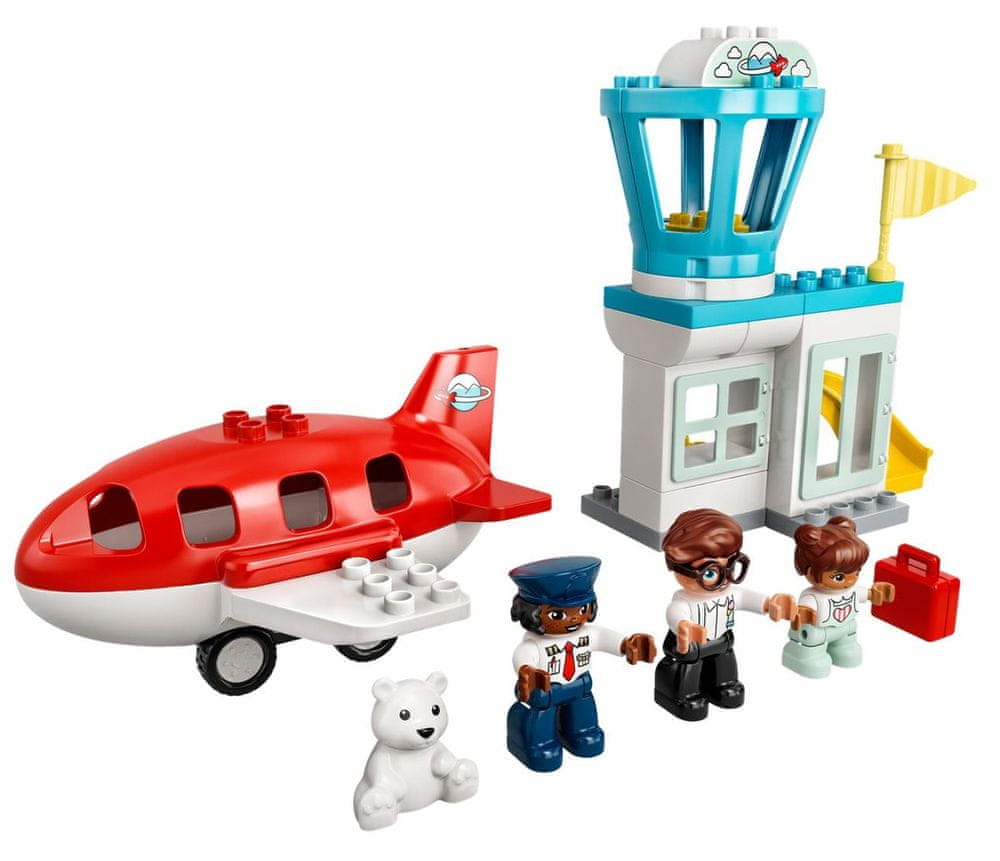 • W komplecie trzy figurki DUPLO® — tata, dziewczynka i pilot — a także samolot ze zdejmowanym dachem, obracana wieża kontroli lotów oraz zjeżdżalnia dla bagaży.