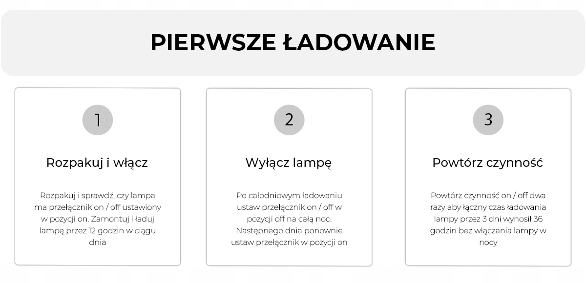 Czas świecenia lampy po codziennym ładowaniu zależy od pory roku i poziomu nasłonecznienia. Im bardziej pochmurny dzień tym krótszy czas pracy. Ważne aby panel solarny był umiejscowiony w najbardziej nasłonecznionym miejscu. Warto również przeprowadzić cykl pierwszego ładowania zgodnie z instrukcją