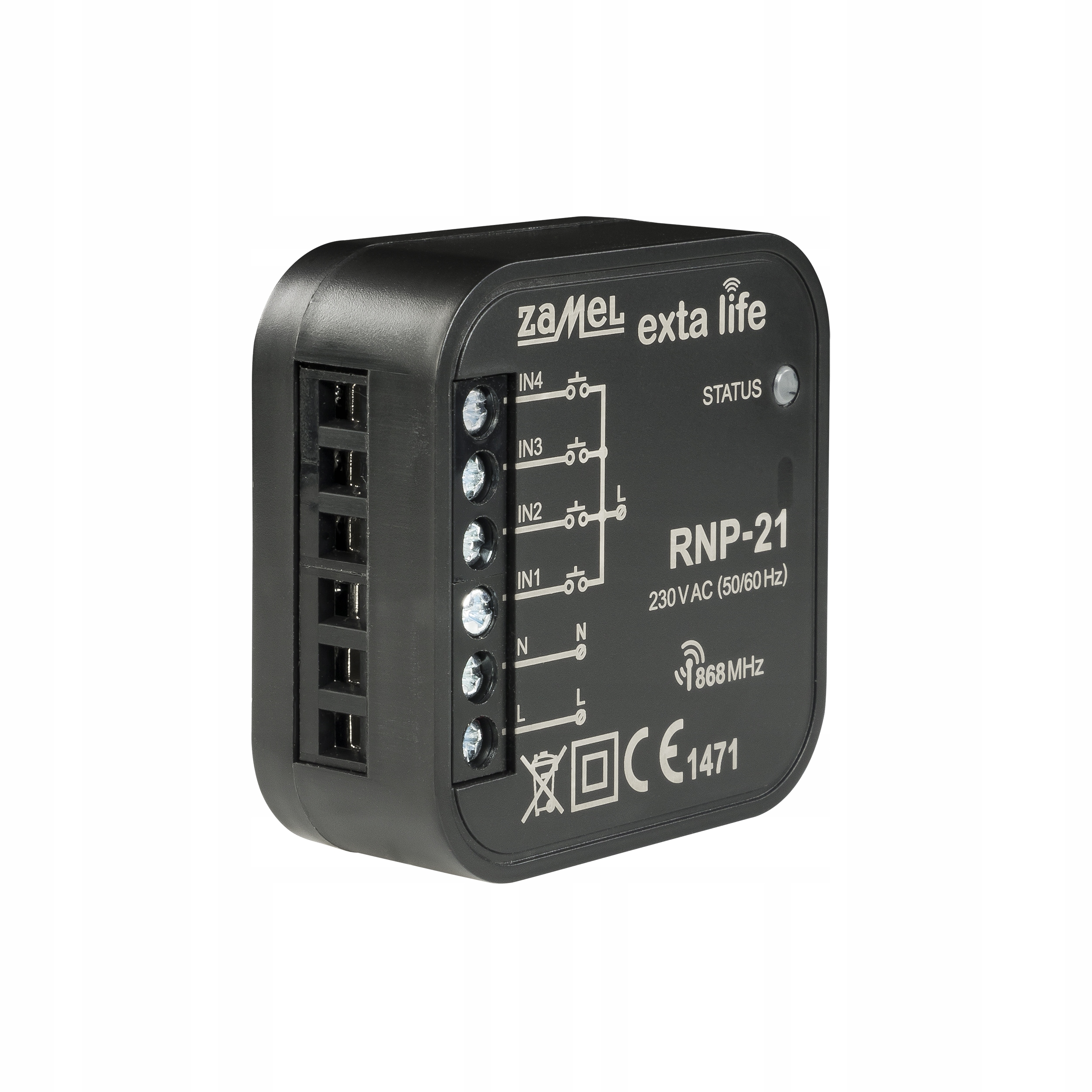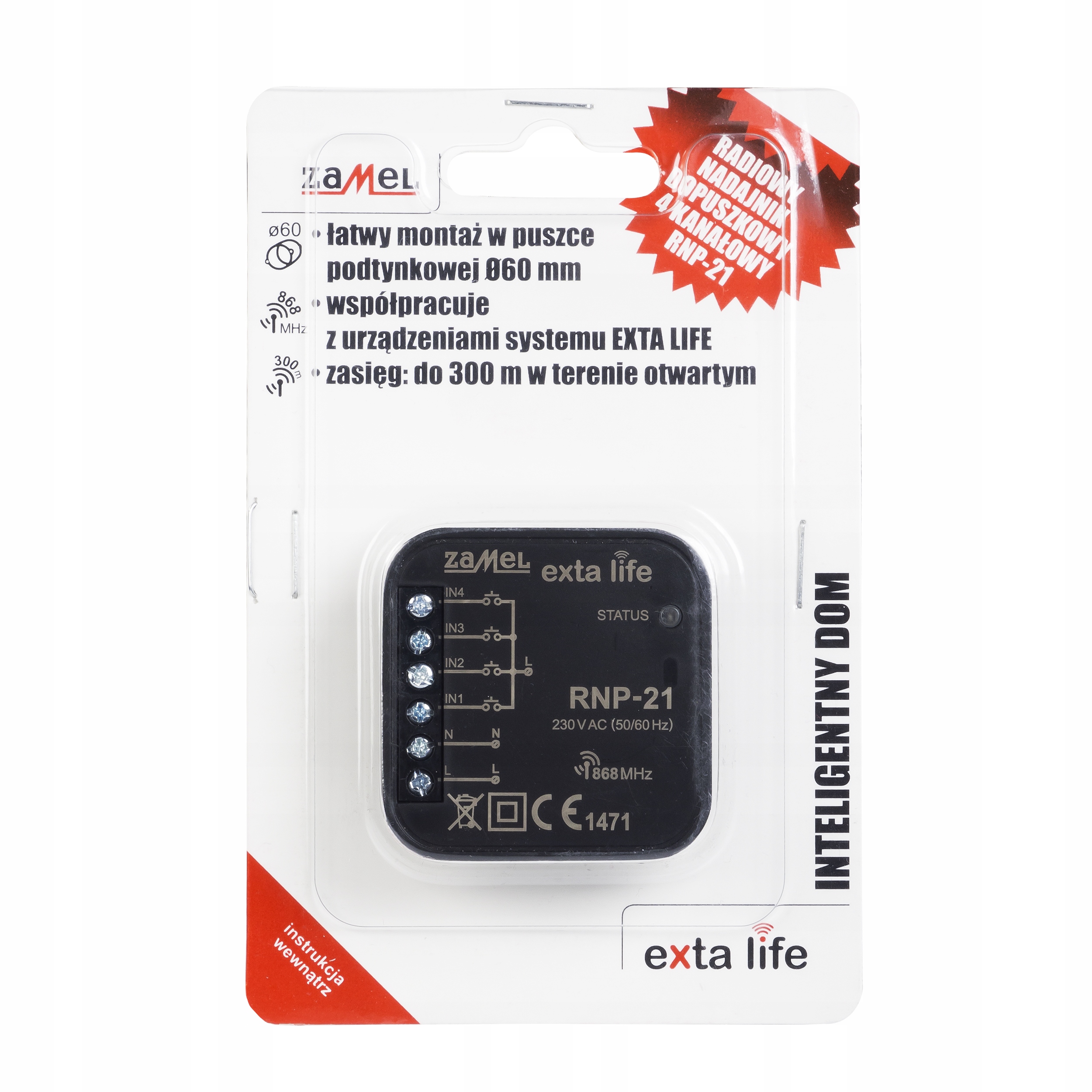 Nadajnik RNP-21 umożliwia bezprzewodowe sterowanie odbiornikami systemu EXTA LIFE. Przeznaczony jest do realizacji takich funkcji jak zdalne załączanie/wyłączanie oświetlenia, regulacja natężenia oświetlenia, zamykanie/otwieranie rolet okiennych i bram garażowych. Nadajnik dedykowany jest do montażu w puszkach podtynkowych (minimum Ø60mm) pod istniejącym osprzętem. Pozwala to na wykorzystanie osprzętu elektroinstalacyjnego dowolnego producenta i nie powoduje ograniczeń w zakresie designu i charakteru wnętrz. Zasilanie urządzenia to napięcie sieciowe 230 V. Posiada cztery wejścia dzięki czemu możliwe jest niezależne sterowanie maksymalnie czterema odbiornikami (kanałami) systemu. Wbudowana dioda LED sygnalizuje transmisję, która jest kodowana co dodatkowo zapewnia bezpieczeństwo sterowania.