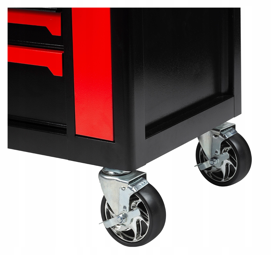 4 duże kółka ułatwią Ci przesuwanie szafki po warsztacie. Dwa kółka posiadają hamulec, więc bez problemu zaparkujesz wózek w wybranym miejscu.