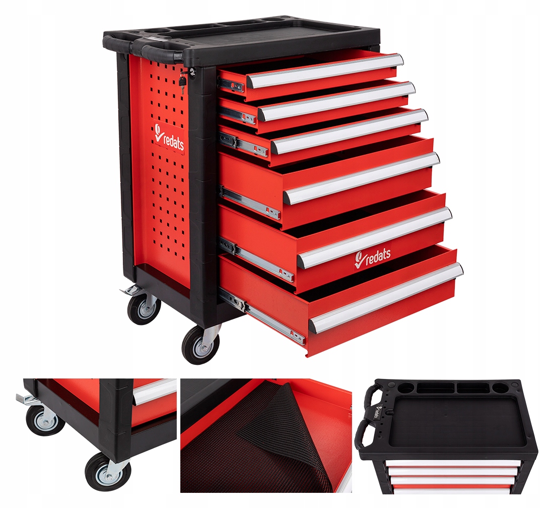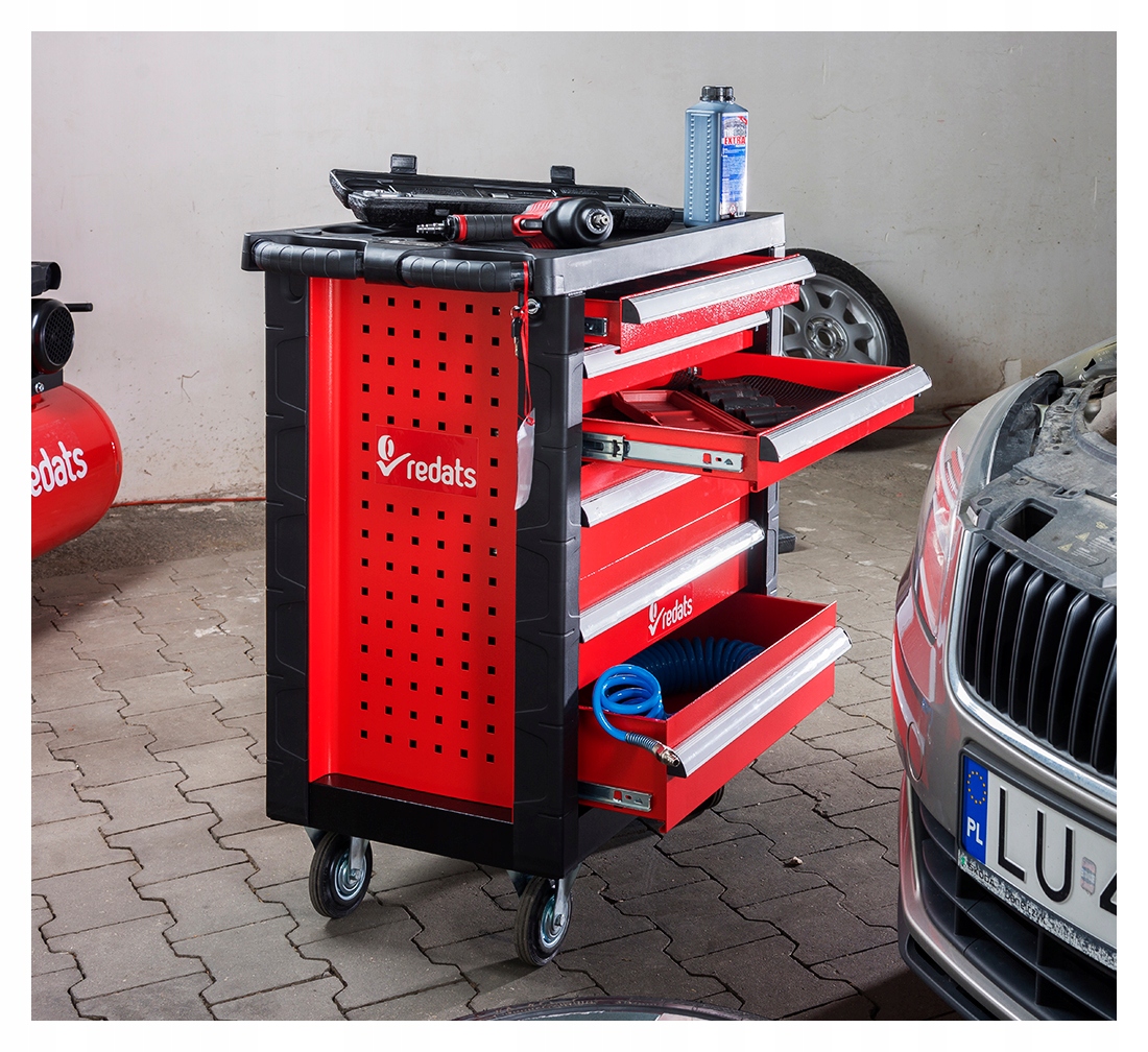 Это мобильный шкаф-он имеет четыре больших и тяжелых колеса, в том числе одно из функция тормоза. Благодаря этому перемещение тележки с необходимым оборудованием является простым и быстрым совершенствование организации работы в мастерской или гараже.