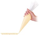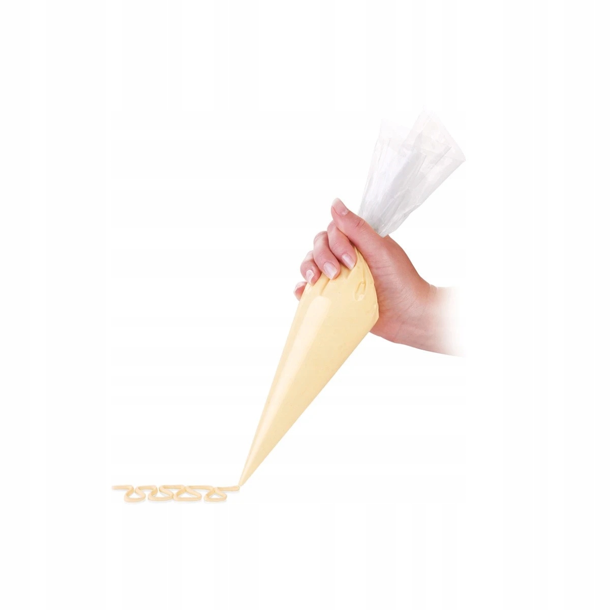 W opakowaniu znajduje się 10 praktycznych, jednorazowych rękawów cukierniczych wykonanych z folii. Są one zwinięte w rolkę, co ułatwia odrywanie pojedynczych woreczków. Po oderwaniu woreczka, wystarczy przyciąć jego końcówkę, aby uzyskać otwór o dowolnej średnicy. Dzięki temu, możemy używać ich do różnych celów.