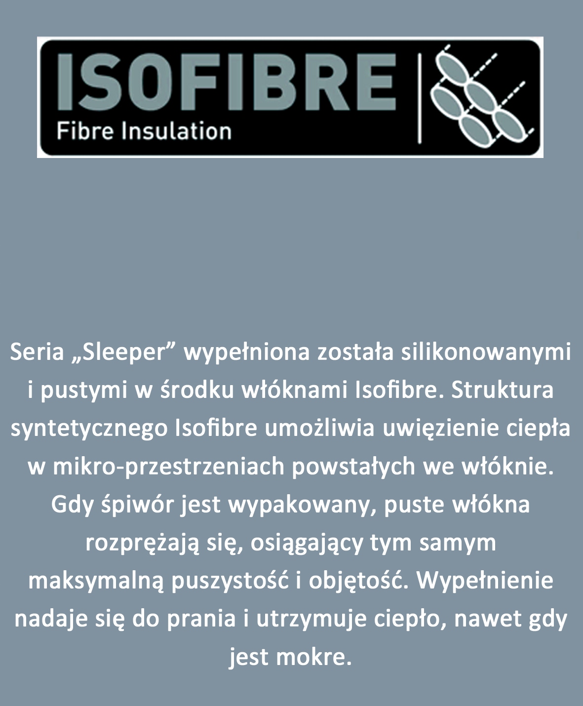 Struktura syntetycznego Isofibre umożliwia uwięzienie ciepła w mikro-przestrzeniach powstałych we włóknach. Gdy śpiwór jest wypakowany, puste włókna rozprężają się, osiągający tym samym maksymalną puszystość i objętość. Wypełnienie nadaje się do prania i utrzymuje ciepło nawet gdy jest mokre.