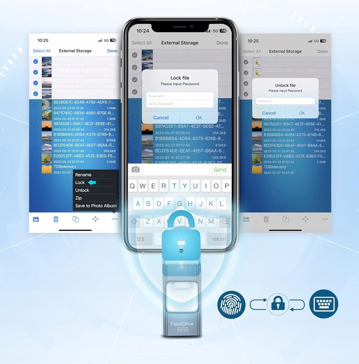 Ochrona hasłem, bezpieczeństwo przechowywania danych: Hasło i Touch ID mogą szyfrować informacje o plikach w aplikacji, chroniąc prywatne pliki. Możesz zdecydować się na zaszyfrowanie całego dysku flash USB lub wybrać, czy chcesz zaszyfrować konkretny plik. Nie martw się, że ktoś ukradnie Twoje pliki.