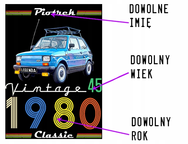 " Zamawiam koszulkę Męską , rozmiar XL , napis: KAZIK , wiek: 40 , rok: 1985 , auto: nr 17 (niebieski maluch)"