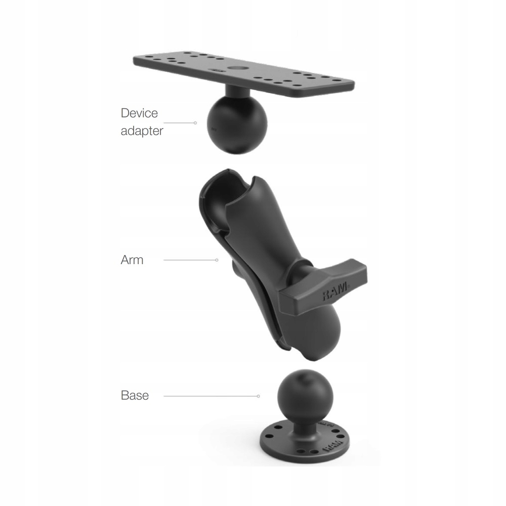 RAM-D-115-E oparty na dużej kuli D to jeden z najbardziej popularnych modeli uchwytu kulowego firmy RAM Mounts. Model ten posiada długie ramie montowane do dużej kuli D z płaską podstawą do montażu echosondy.