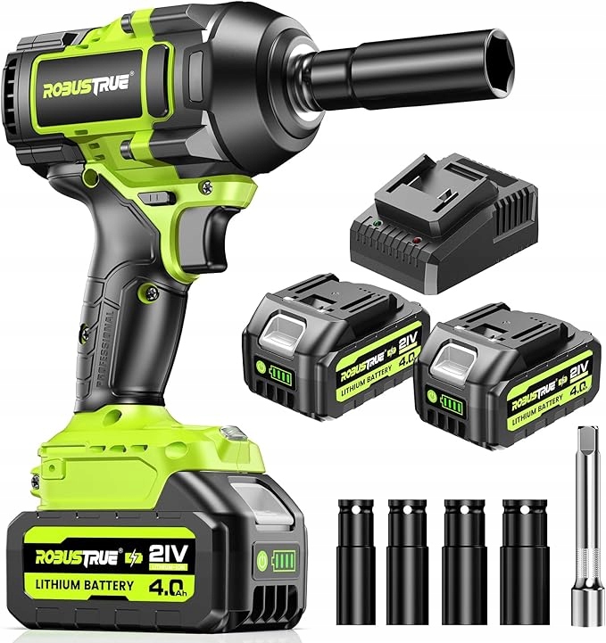 ✅ Zestaw składa się z klucza udarowego ROBUSTRUE, 2 akumulatorów 20V, ładowarki do akumulatorów, kompletu 4 kluczy nasadowych, klipsa do paska oraz przedłużki. Wszystko to spakowane jest w pojemną walizkę.
