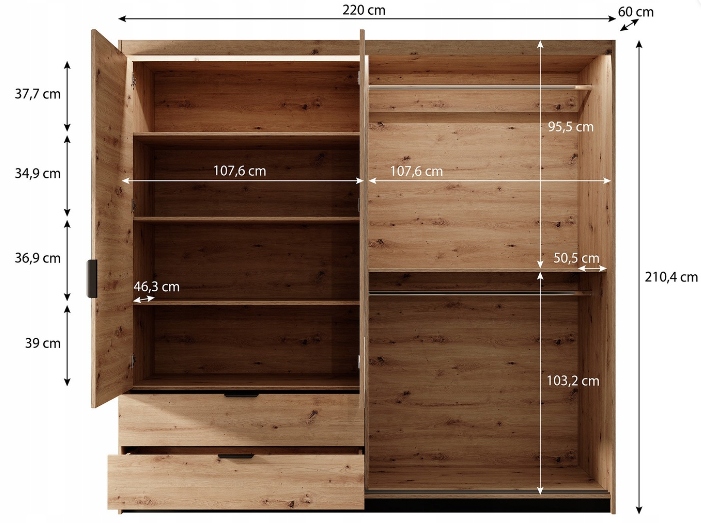 Szafa wyposażona w lustra oraz praktyczne szuflady. Lewa strona szafy zawiera wnękę z 3 półkami, pod którymi znajdują się 2 przestronne szuflady. Prawa strona szafy zawiera pojemną wnękę wyposażoną w 2 drążki do zawieszania ubrań. Oświetlenie LED dostępne w opcjach tuż nad parametrami produktu.