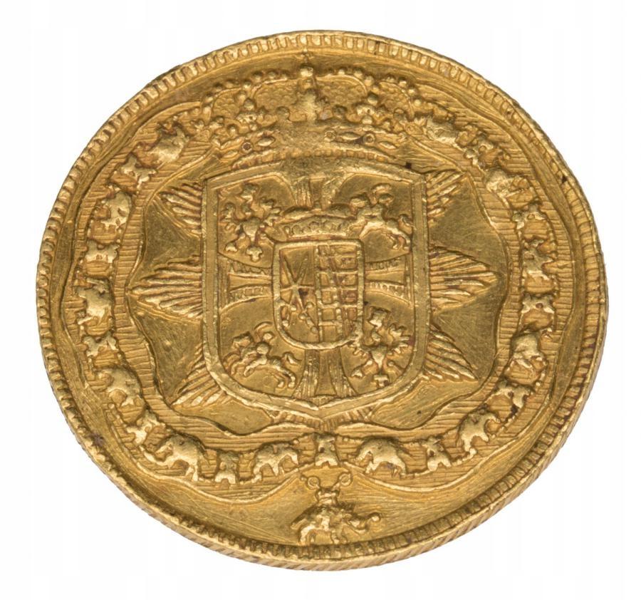rewers: w tarczy czwórdzielnej krzyż z tarczką sercową pośrodku,Orzeł i Pogoń; w polu sercowym w słup herby elektora saskiego i Saksonii pod czapką elektorską; tarcza uwieńczona koroną królewską,położona na tle gwiazdy oredrowej,otoczona łańcuchem Orderu Słonia;