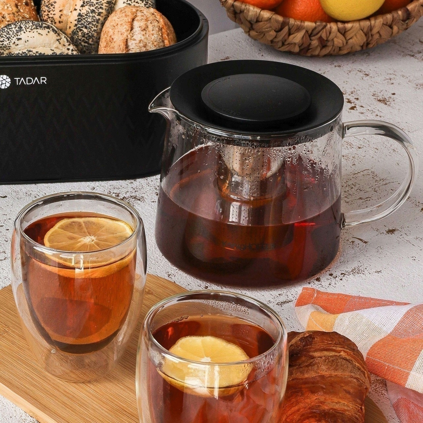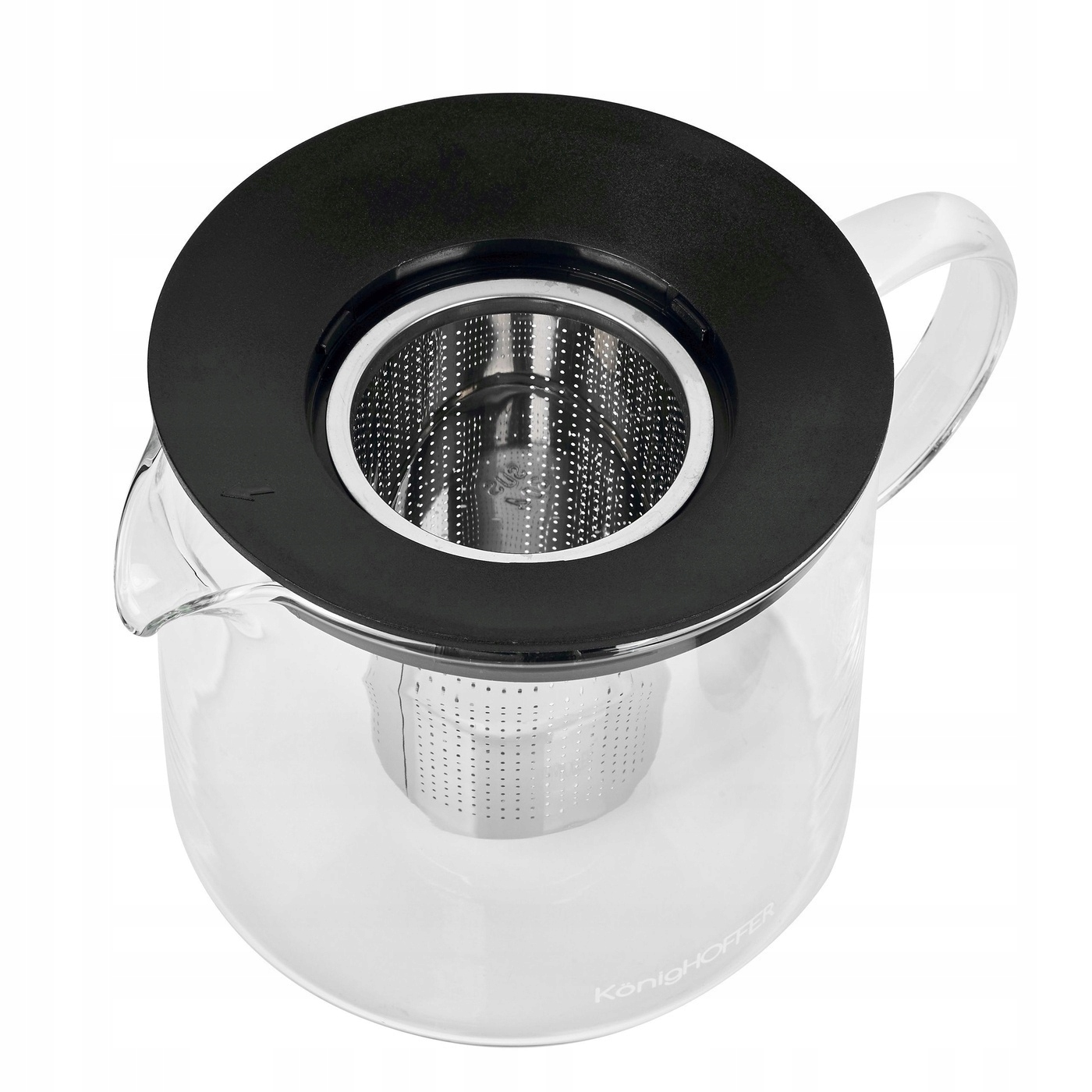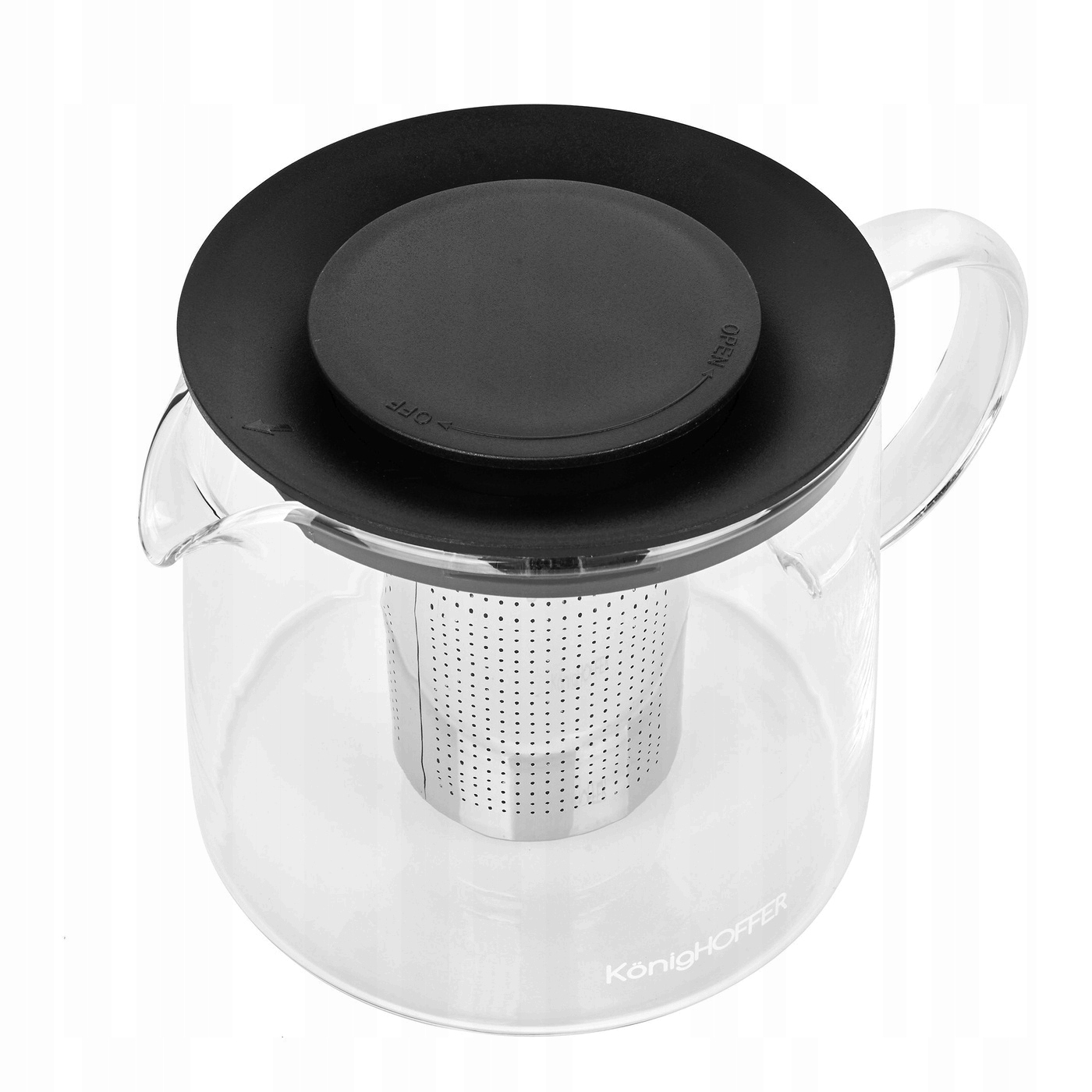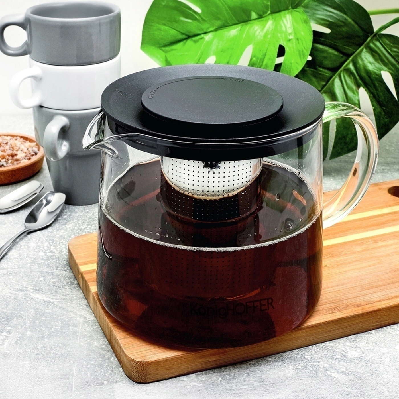 Dzbanek do herbaty z zaparzaczem Konighoffer Andrea 1,5 l został wyprodukowany ze szkła borokrzemowego. Jest ono lekkie, ma krystaliczną strukturę i świetnie podkreśla barwę napojów. Ma również dużą odporność na szok termiczny, zarysowanie i matowienie. W takim dzbanku możesz więc robić gorącą herbatę i domową lemoniadę z kostkami lodu. W zestawie znajduje się też nierdzewny wkład w postaci zaparzacza. Dzięki niemu sprawnie zaparzysz herbatę liściastą i oddzielisz namoknięty susz od napoju. Pokrywa dzbanka wykonana jest z czarnego bakelitu. Chroni zawartość przed zanieczyszczeniem. Zabezpiecza też przed rozlaniem podczas przenoszenia. Produkt ma również wylewkę do precyzyjnego nalewania. Szklany dzbanek umyjesz w zmywarce. Elegancko rozbudujesz także serwis deserowy, który codziennie używasz w swoim domu.