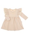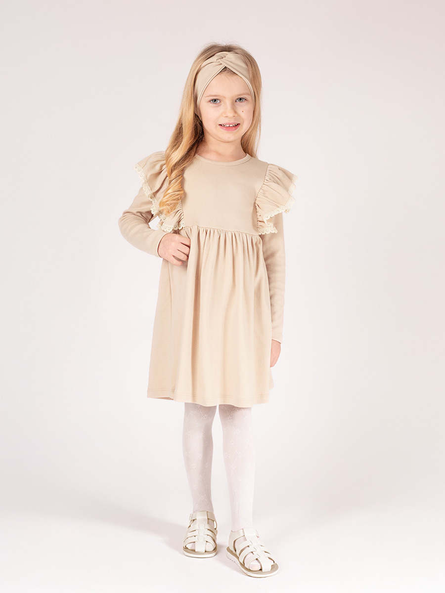 Modna sukienka z długim rękawem dla dziewczynki, wykonana z beżowej bawełny. Zapinana na plecach na bezniklowego napa tworzącego modne zapięcie tzw. łezkę. Z przodu zdobne falbanki, które zostały wykończone koronką. Sukienka zakończona również marszczoną falbaną. Materiał bezpieczny dla skóry dziecka.