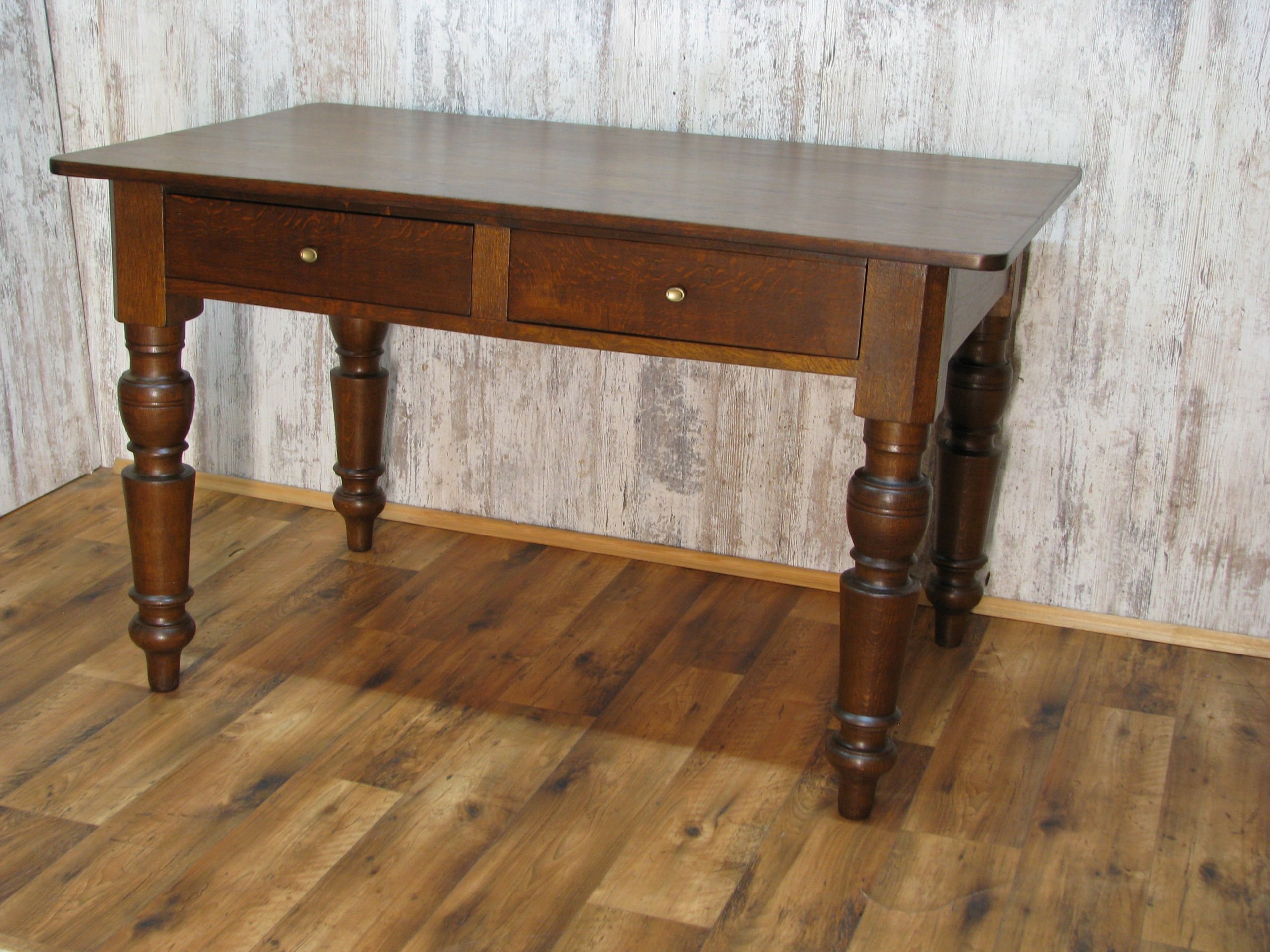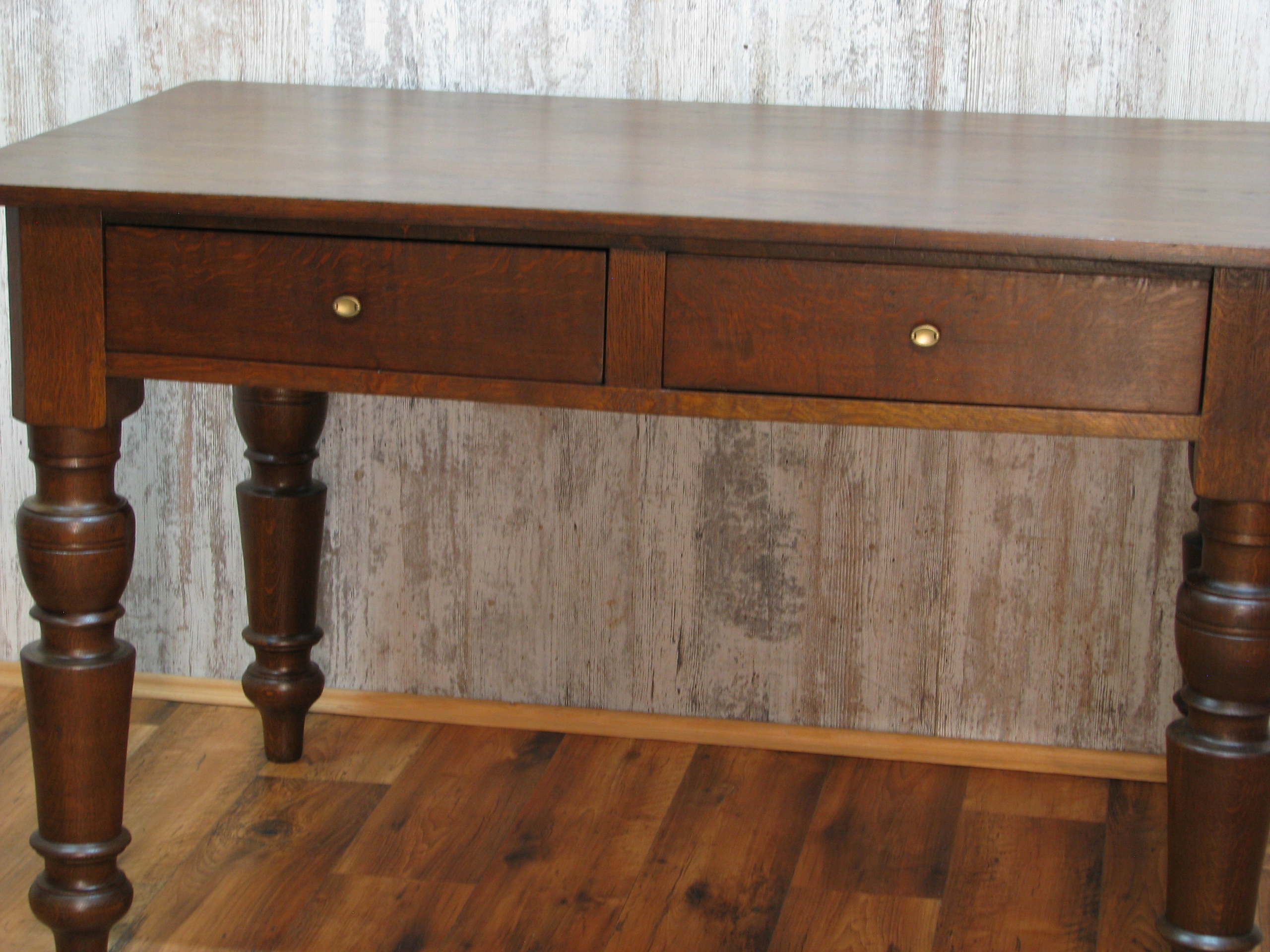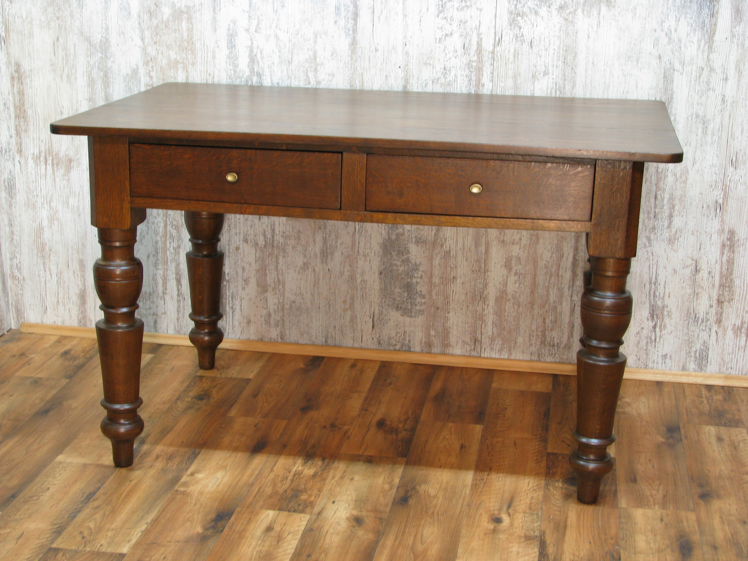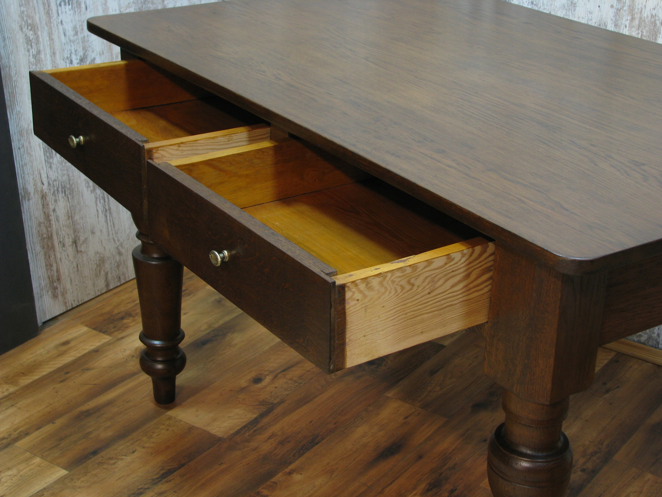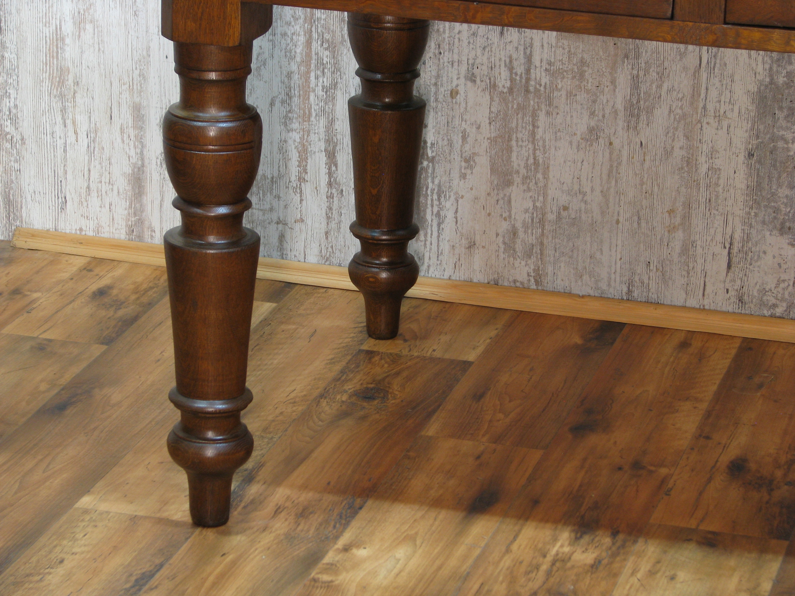 Uwidoczniona oryginalna piękna faktura starego drewna, mebel wykonany z litego drewna dębowego pięknymi dużymi toczonymi nogami na blacie delikatne ryski .