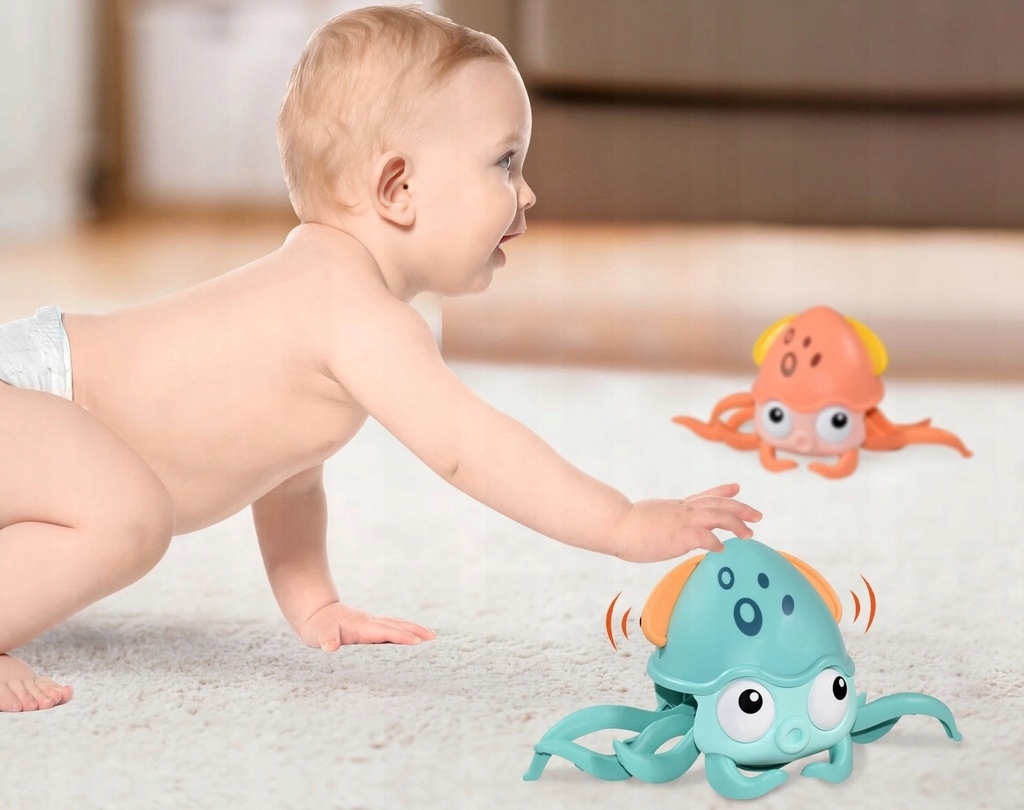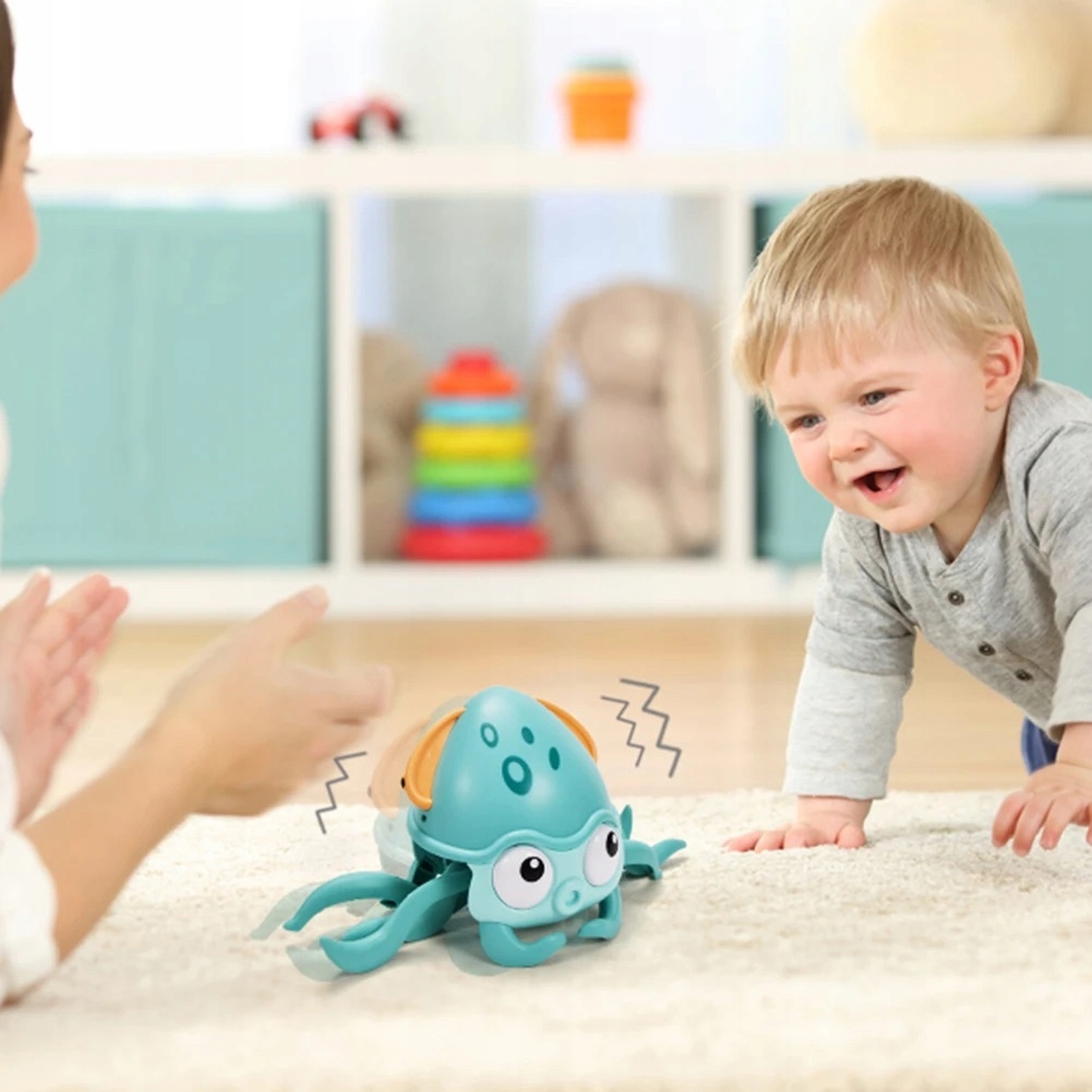 Ta ośmiorniczka potrafi szybko pełzać! Dzięki temu będzie stanowić doskonałe wyzwanie dla Twojego dziecka, aby za nim nadążyć. Co więcej, obserwowanie ruchów zwierzaka, będzie fanatycznym treningiem zmysłu wzroku.