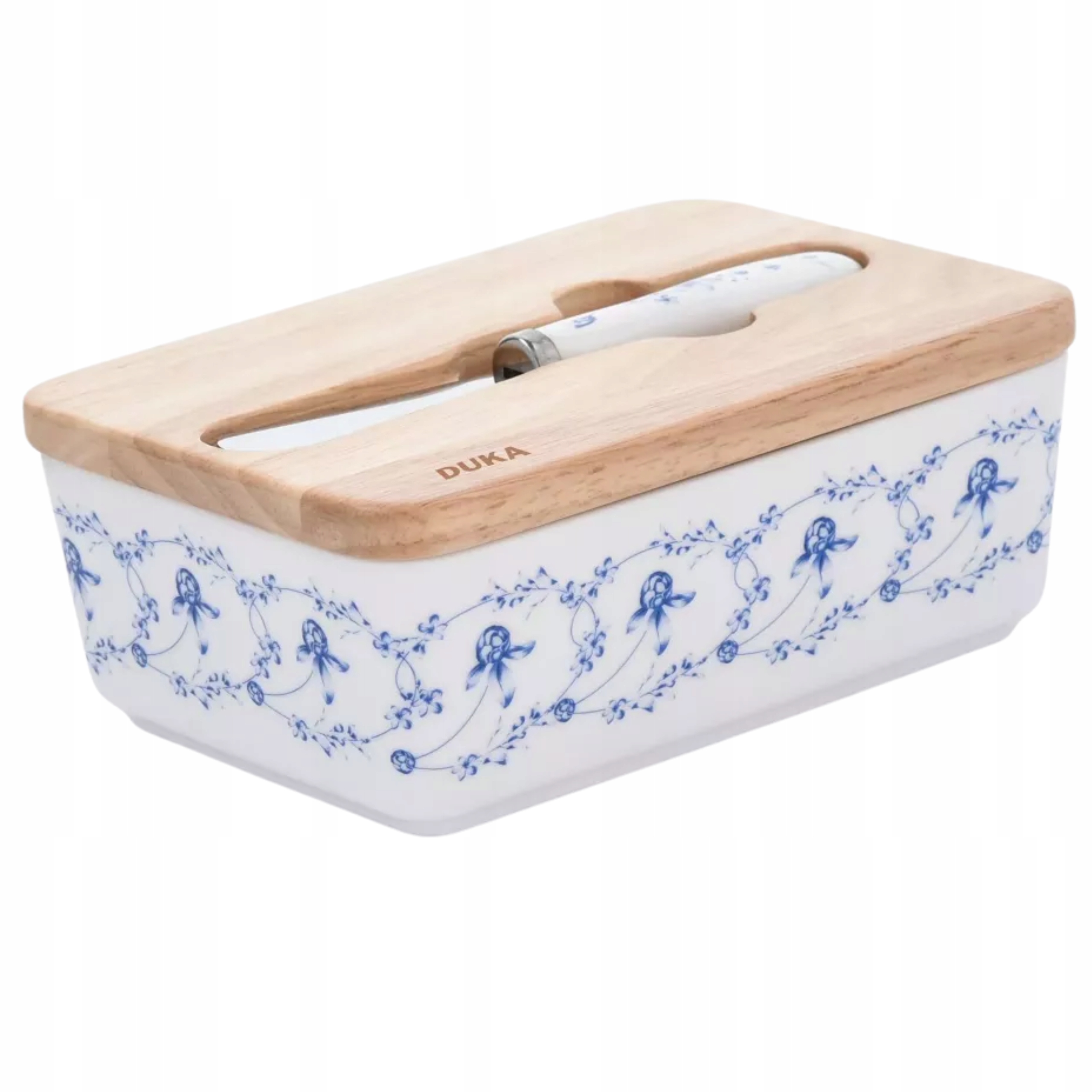 Elegancja i funkcjonalność w Twojej kuchni! Maselniczka DUKA FIRANDE to połączenie ponadczasowego designu i praktyczności. Kobaltowe zdobienia inspirowane skandynawską sztuką ceramiczną nadają jej wyjątkowego charakteru, a drewniana pokrywka skutecznie chroni masło przed wysychaniem i pozwala zachować idealną konsystencję do smarowania.