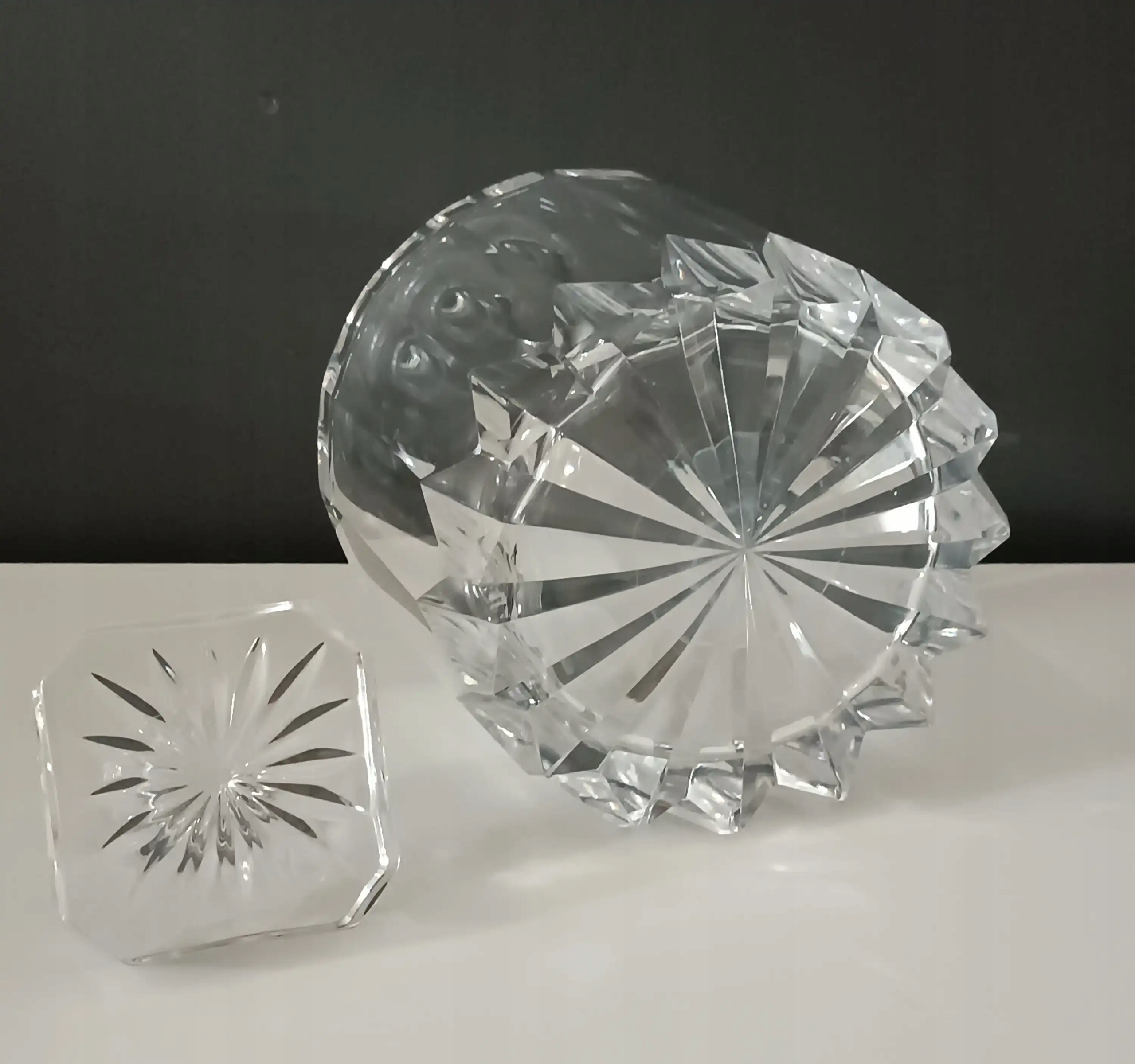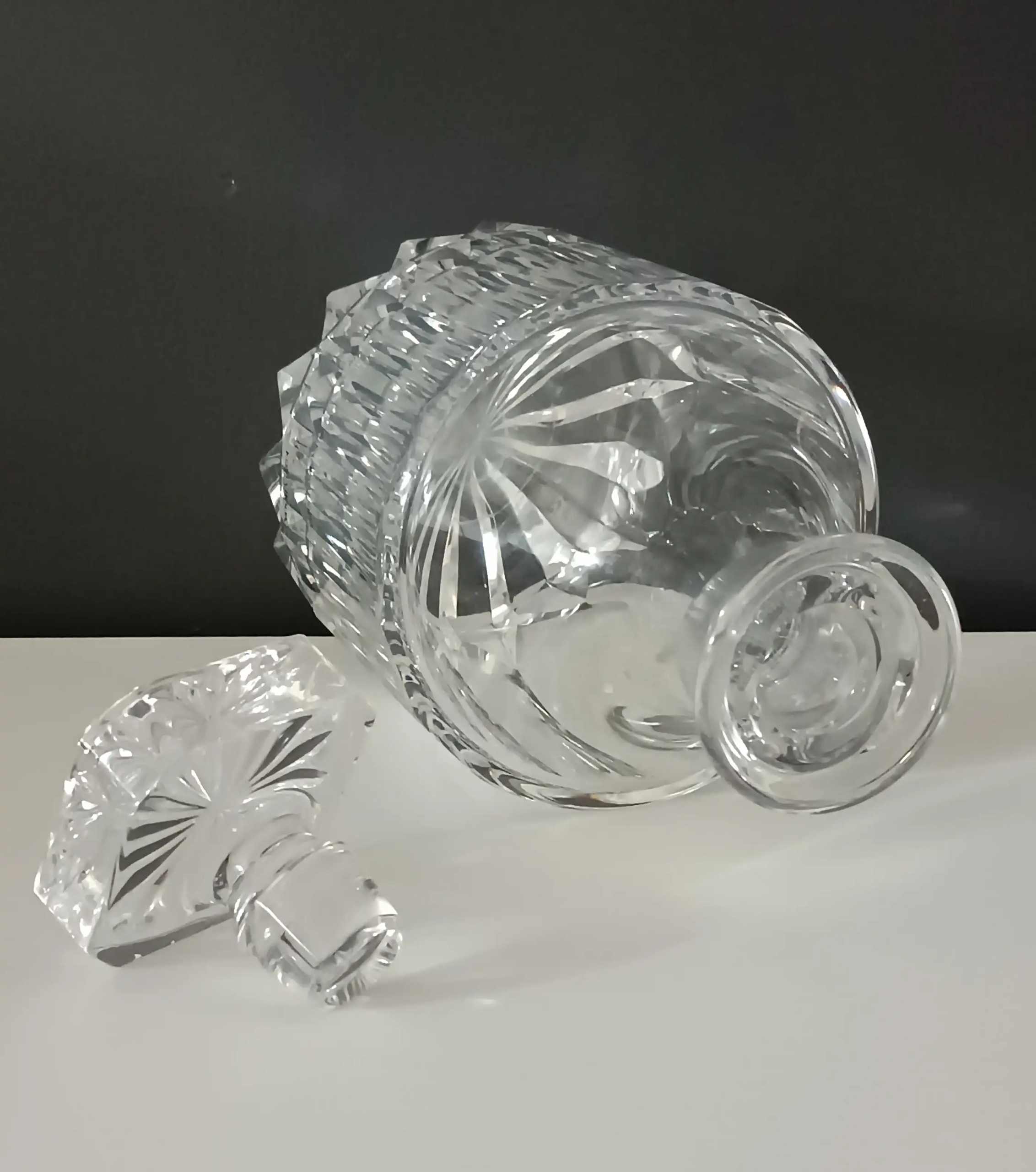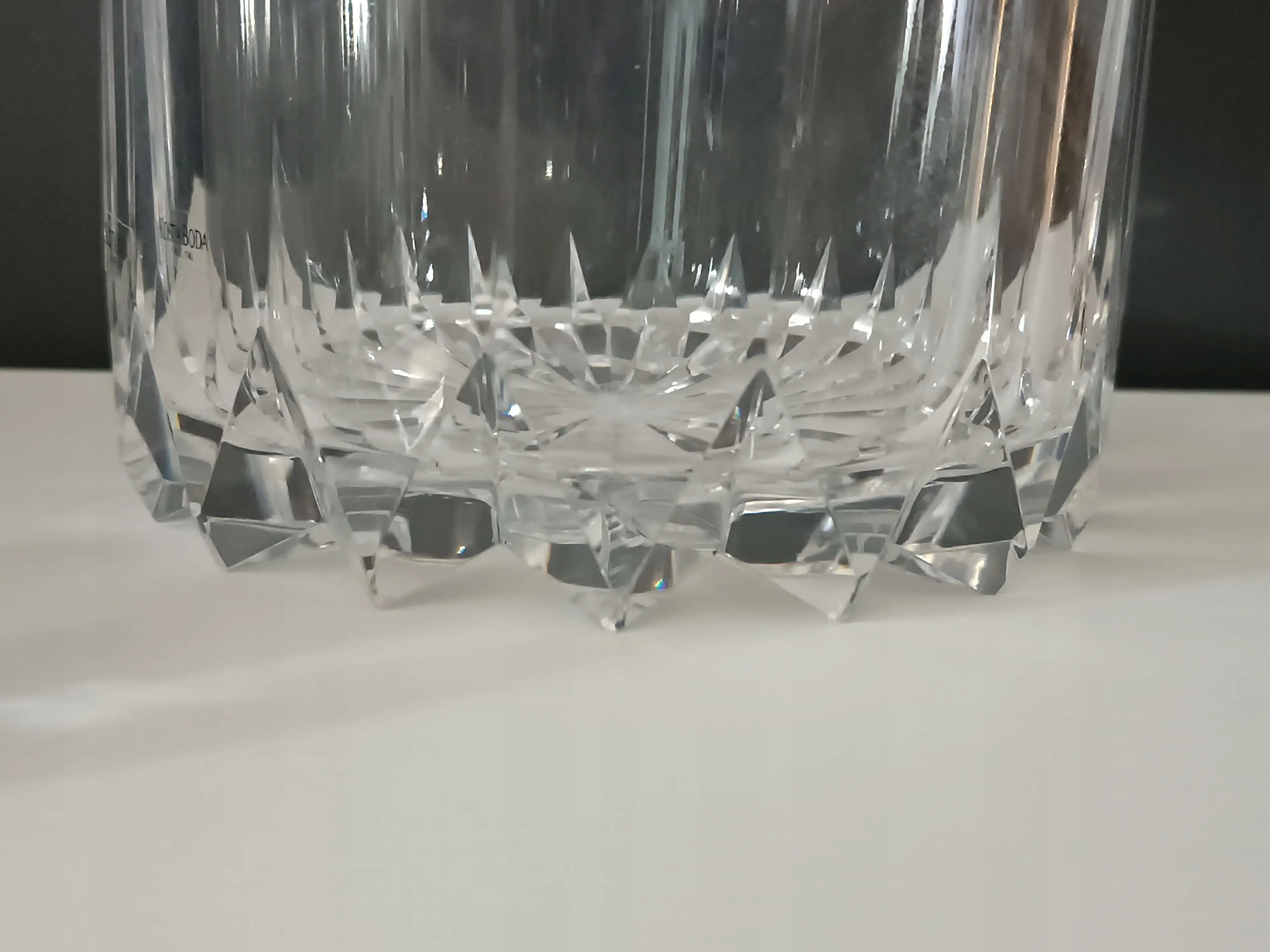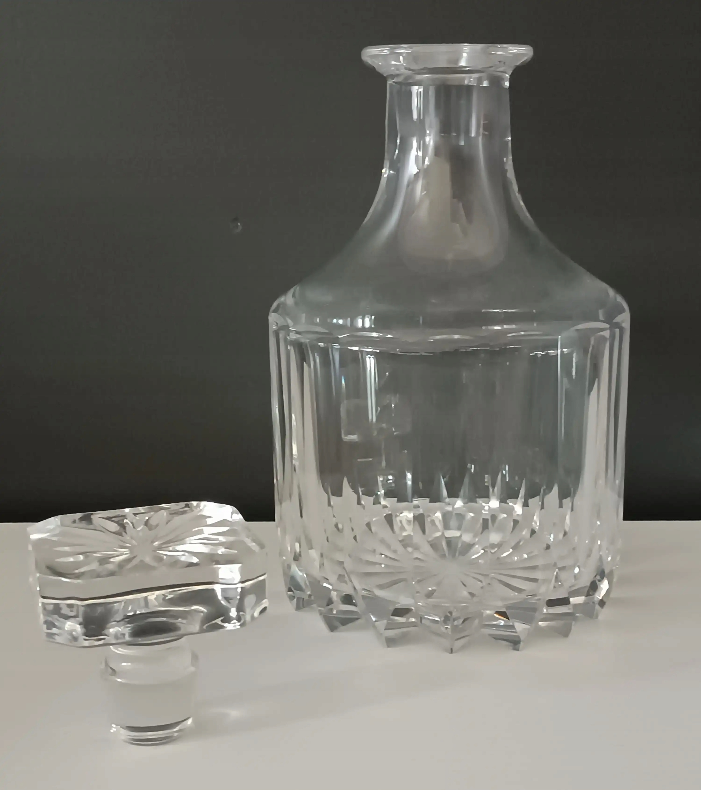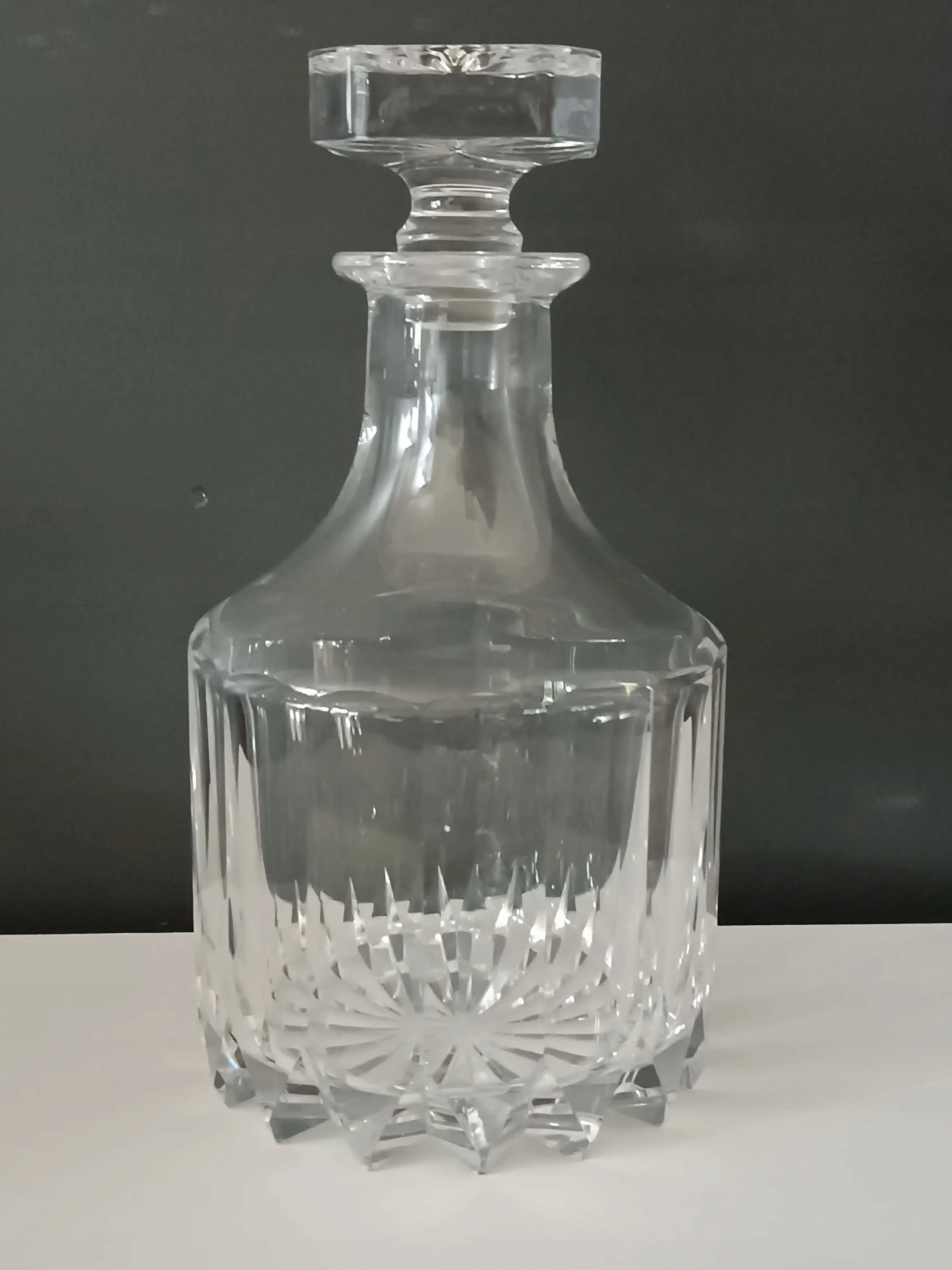 Karafka przedstawiona na zdjęciu to elegancki naczynie wykonane z przezroczystego szkła.