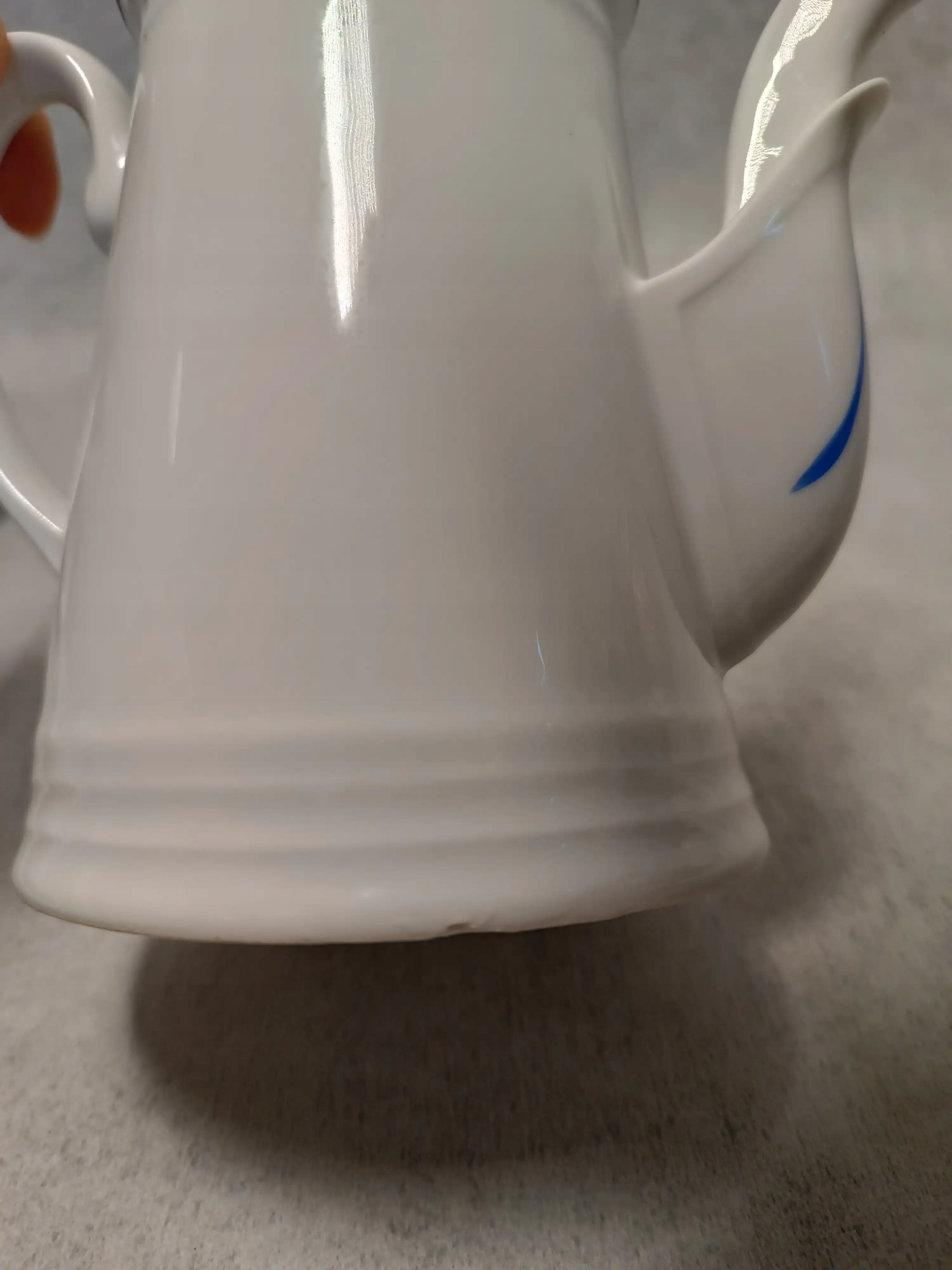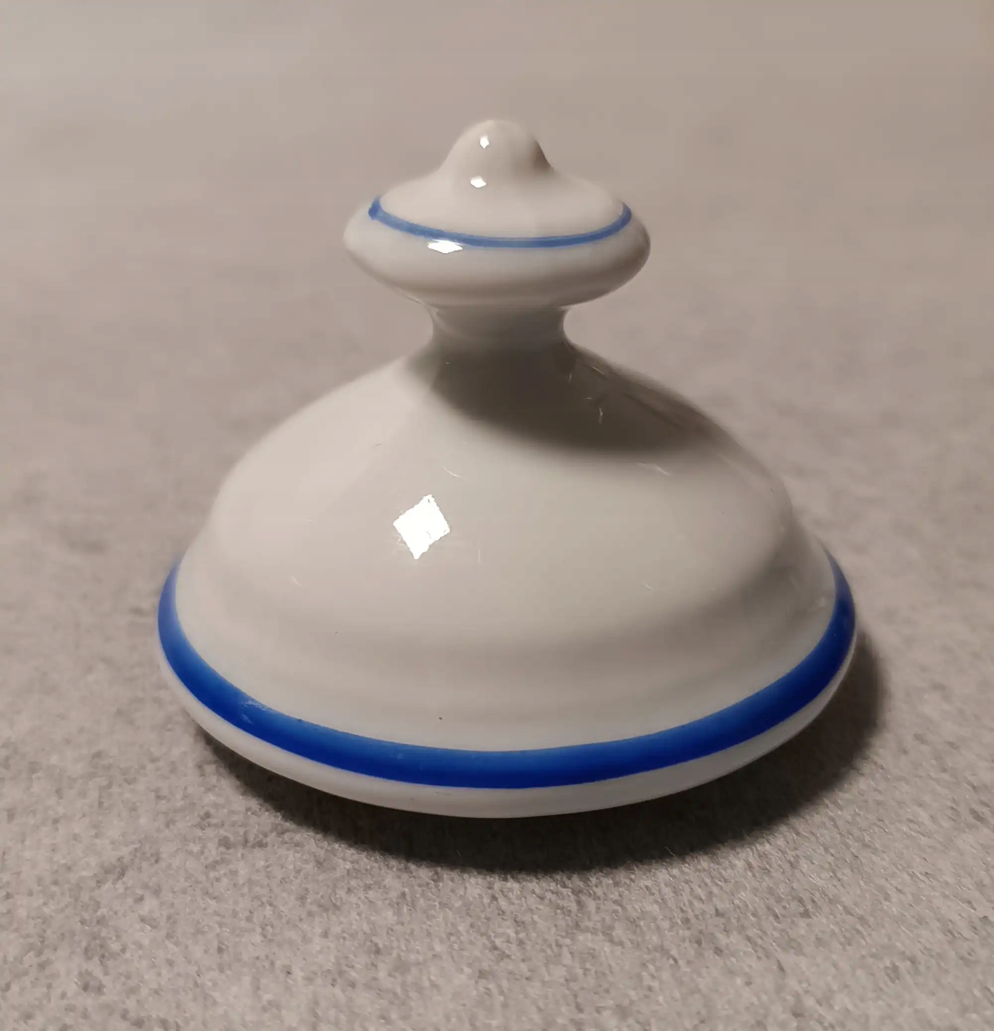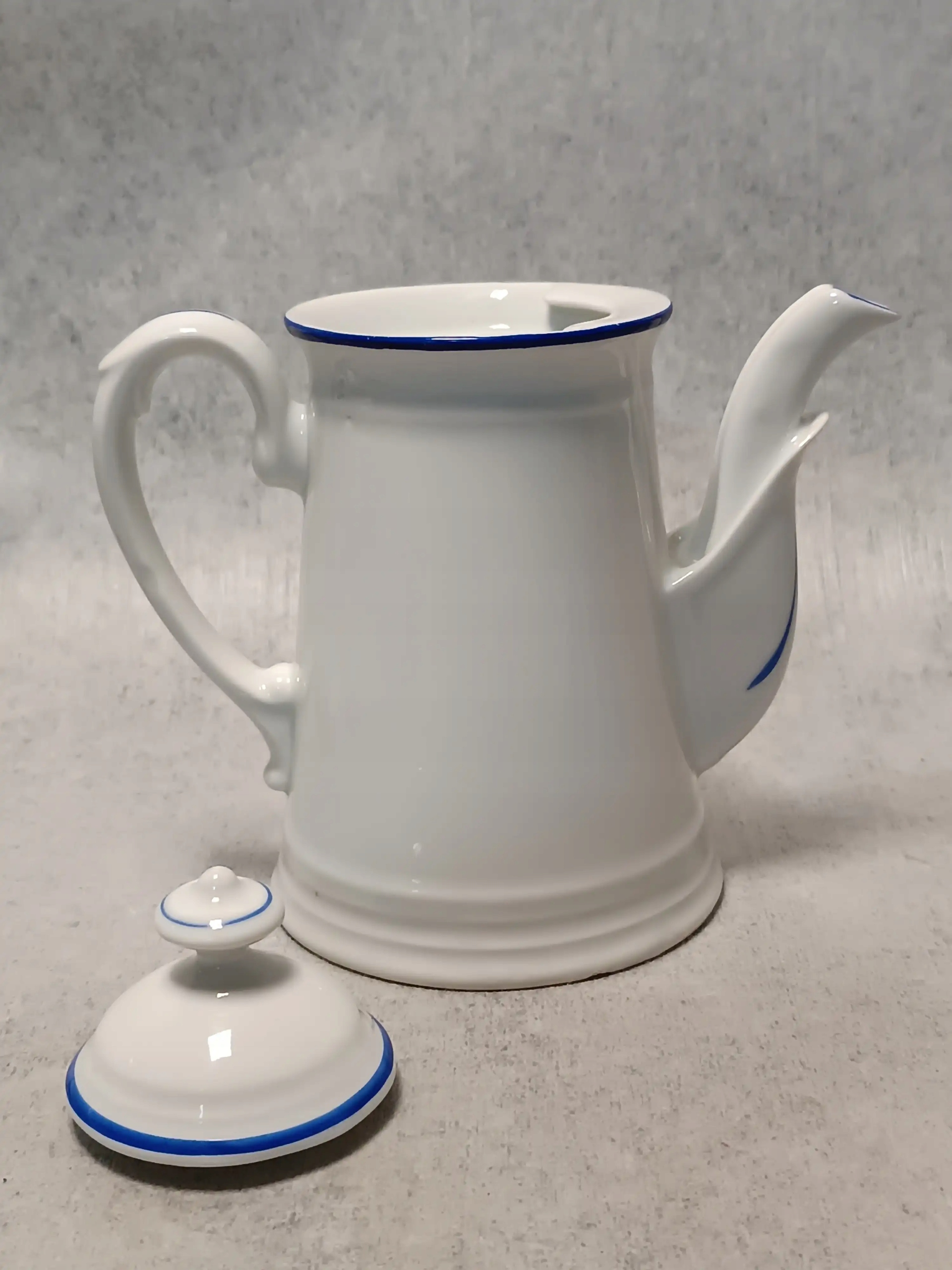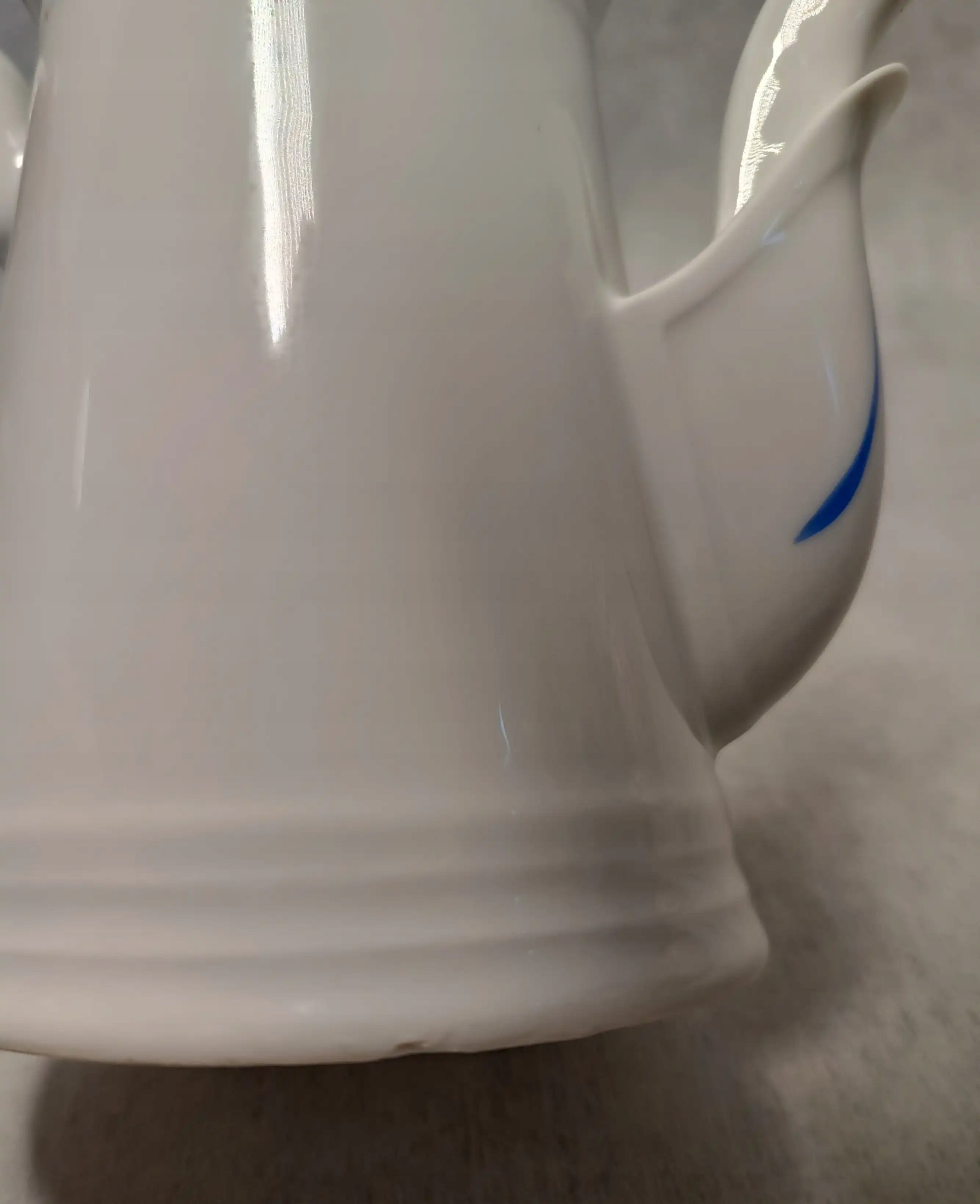 Dekoracja: Jedyną dekoracją, są cienkie, kobaltowe linie, które obrysowują krawędzie pokrywki, uchwytu i tworzą delikatny wzór na korpusie.