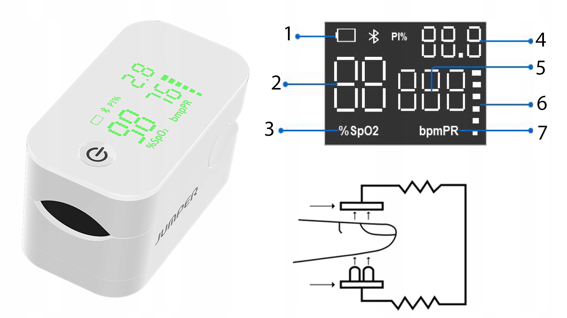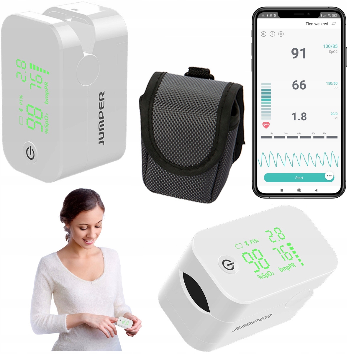 Poprzez Bluetooth można sparować pulsoksymetr ze smartfonem, aby monitorować wyniki za pomocą aplikacji JUMPER Health.