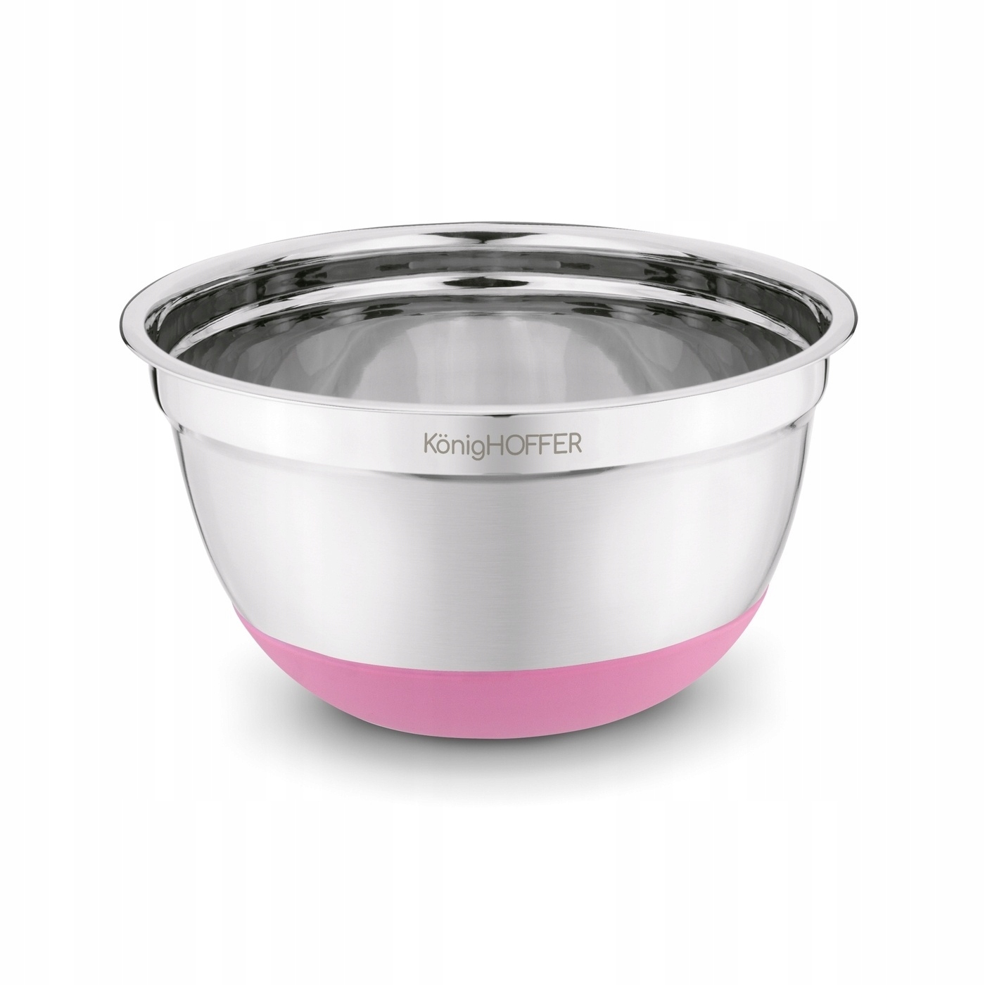 Metalowe miski Konighoffer 16 / 20 / 24 / 28 cm korzystają z podstawy pokrytej kolorowym silikonem. Dzięki niej naczynia nie ślizgają się podczas mieszania i stoją stabilnie na blacie podczas serwowania jedzenia. Zestaw pomoże ci w miksowaniu składników do wypieków. Zrobisz w nich ciasta i kremy tortowe, a nawet ubijesz śmietanę rózgą kuchenną. Wygodnie połączysz też składniki surówek, sałatek oraz na kotlety mielone. Miski ze stali nierdzewnej z silikonowym spodem Konighoffer mają pojemność 1 / 1,8 / 3,3 / 5,4 litra. Ich korpus jest z zewnątrz wykończony na wzór surowego, satynowanego metalu. Komplet zapewnia bezpieczeństwo dla składników spożywczych. Nie wpływa na smak oraz aromat, dlatego dobrze wesprze cię w przechowywaniu (nawet w lodówce). Miski zostały wykonane solidnie, więc zostaną w domowej kuchni na długie lata. Zaopatrzysz się w swój własny zestaw misek ze stali nierdzewnej, w pełni dostosowany do różnych wymagań i potrzeb.