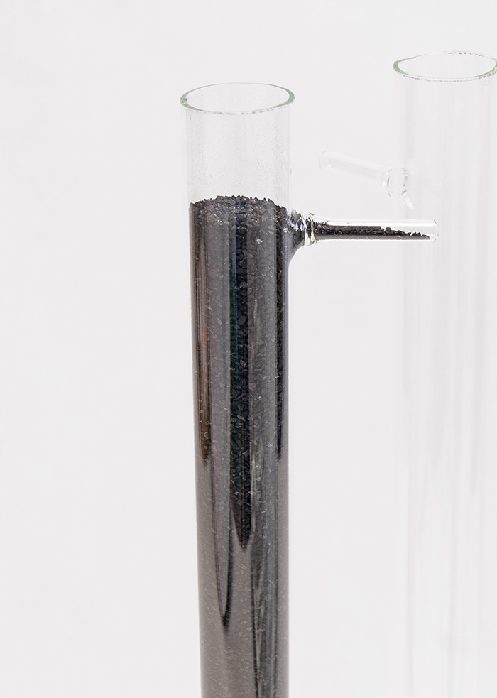 Oferujemy na sprzedaż szklaną kolumnę filtracyjną z grubego szkła. Jest ona postawiona na stabilnej podstawie. Służy do flitrowania cieczy przez węgiel aktywny.