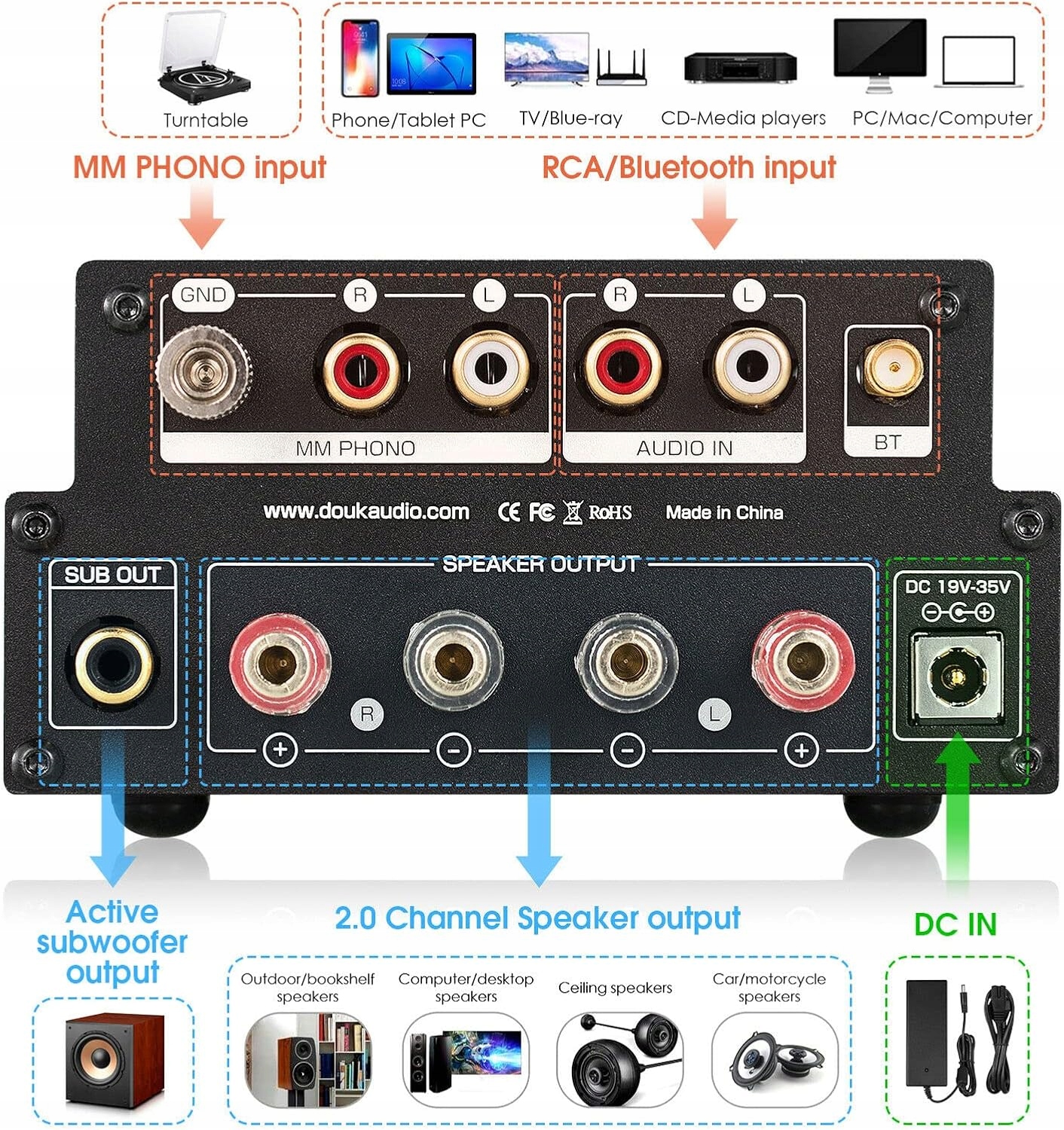 Bluetooth 5.0 i Stereo RCA: wejście MM Phono przekształca sygnał fono na poziom liniowy i wzmacnia go niskim poziomem szumów i wysokiej jakości komponentami, zapewniając czysty i czysty dźwięk.