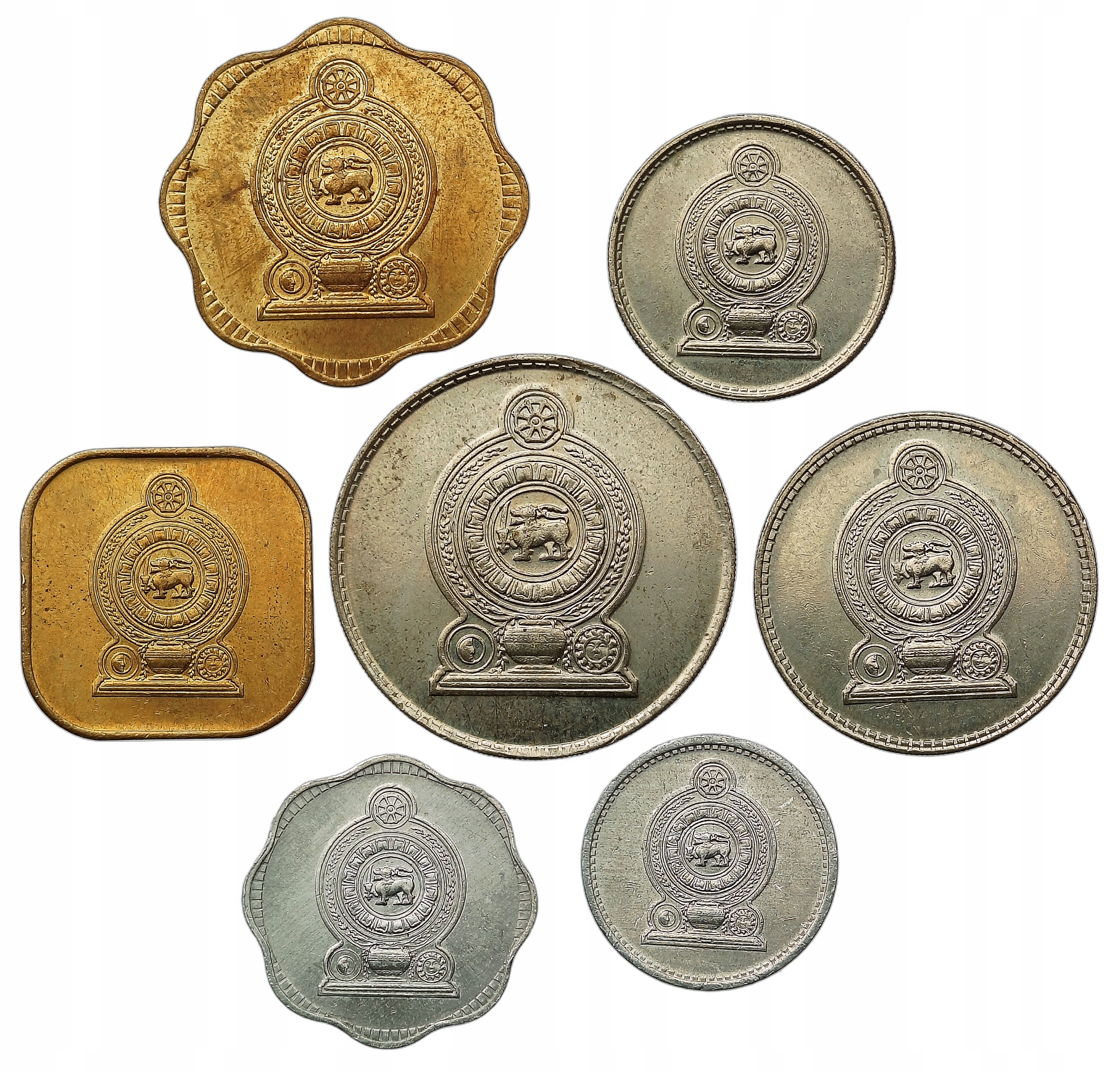 Zestaw siedmiu monet z Sri Lanki o nominałach 1 cent, 2 centy, 5 centów, 10 centów, 25 centów, 50 centów oraz 1 rupia, wyemitowanych w 1975 roku, w stanie XF - AU. Monety te stanowią klasyczny zestaw, który odzwierciedla okres ekonomiczny Sri Lanki w latach 70-tych XX wieku. Wzory na monetach przedstawiają tradycyjne symbole narodowe oraz elementy związane z kulturą Sri Lanki. Zestaw ten jest wyjątkowym dodatkiem do kolekcji numizmatycznych, szczególnie dla pasjonatów monet z Azji Południowej i historii monetarnej Sri Lanki.