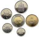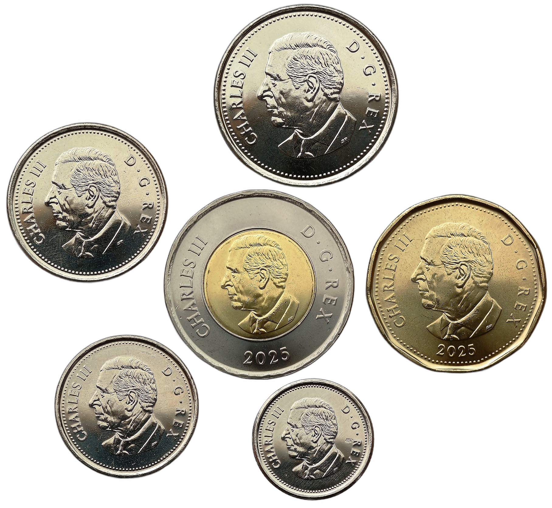 Zestaw sześciu monet z Kanady o nominałach 5 centów, 10 centów, 25 centów, 50 centów, 1 dolar i 2 dolary, wyemitowanych w 2025 roku, w stanie menniczym (UNC). Monety te przedstawiają wizerunki różnych zwierząt, będące częścią serii poświęconej dzikiej faunie Kanady. Na awersie znajduje się portret króla Karola III, który stał się symbolem nowej ery kanadyjskiej numizmatyki.