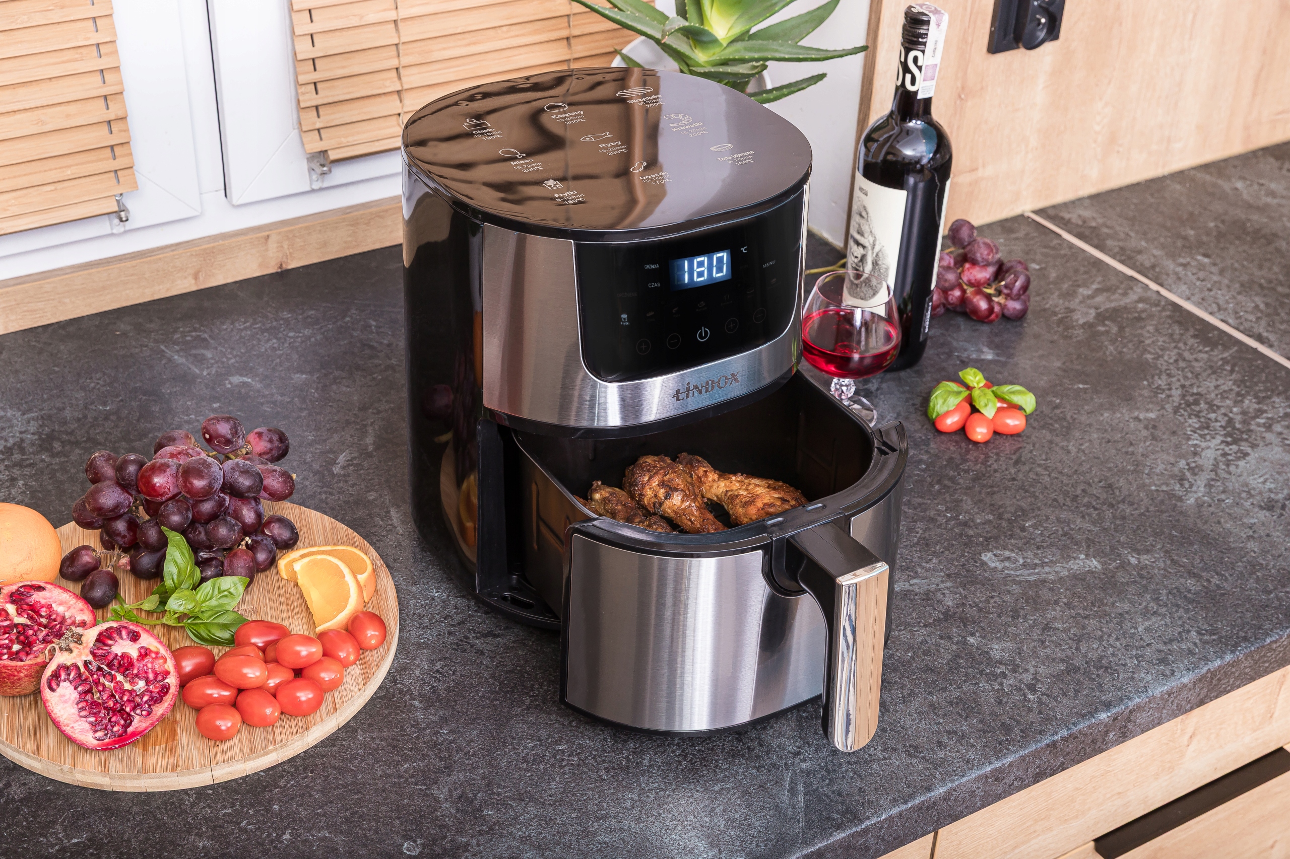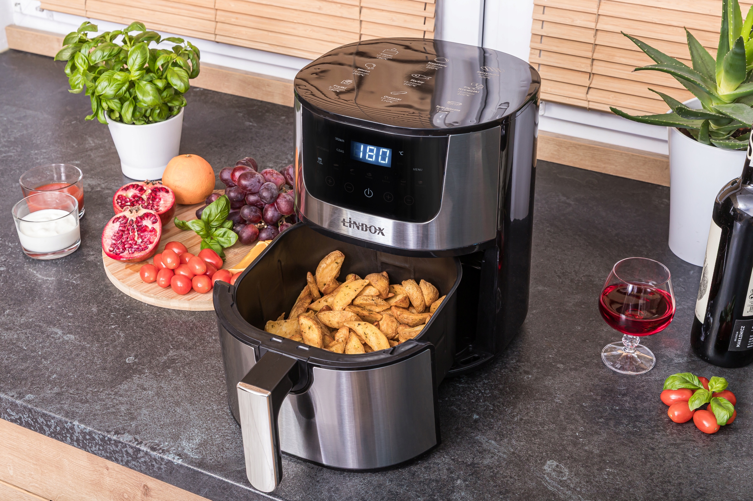 Frytkownica wyposażona jest w 7 predefiniowanych programów. Wystarczy wrzucić produkty do koszyka, wybrać odpowiedni program i kliknąć START.