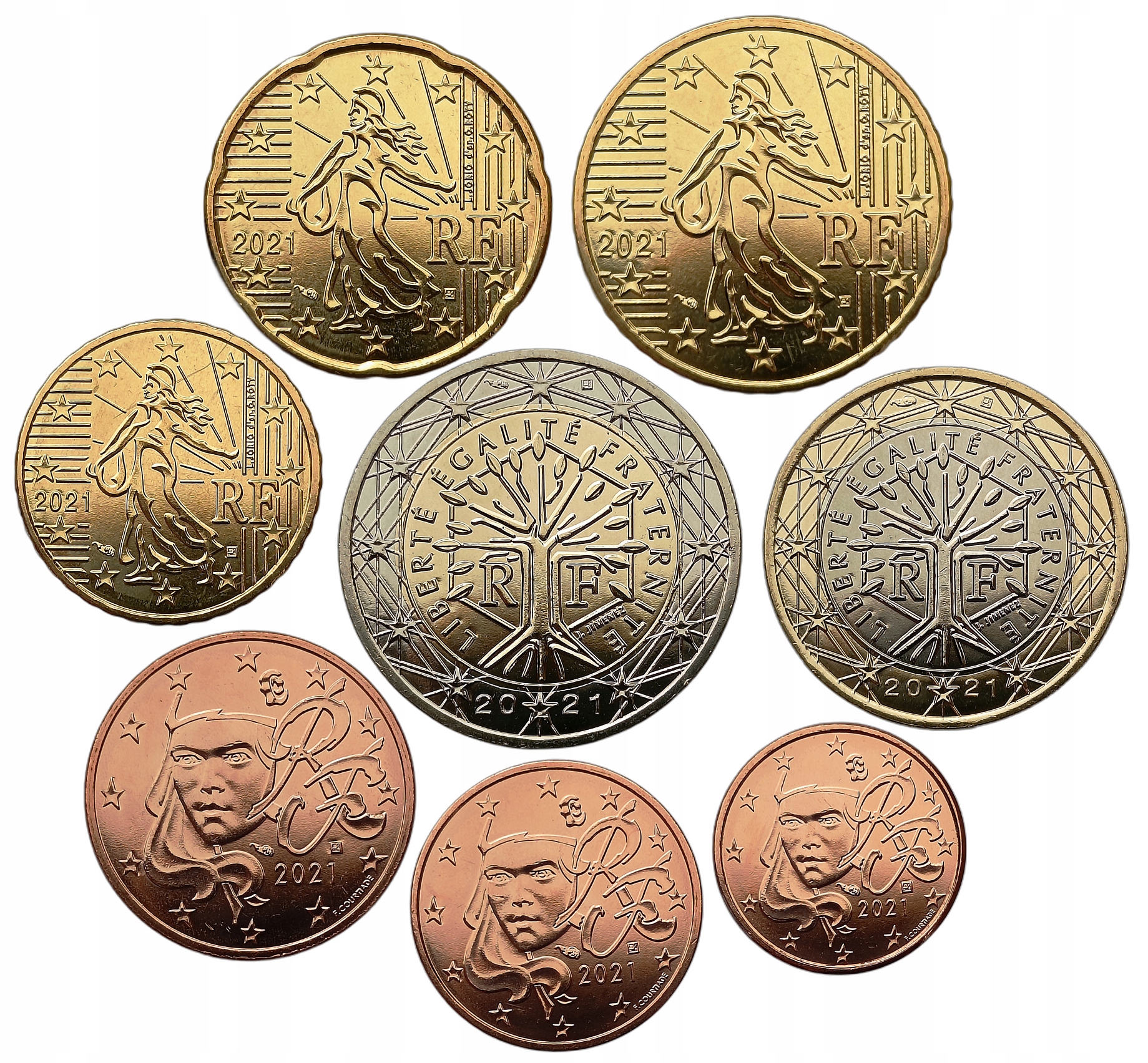 Zestaw ośmiu monet z Francji z 2021 roku, obejmujący nominały od 1 euro centa do 2 euro. Monety znajdują się w stanie niekrążonym (UNC), co czyni je doskonałym wyborem do kolekcji. W zestawie znajdują się zarówno mniejsze monety, jak i te o wyższych nominałach, oferując pełny przekrój waluty euro.