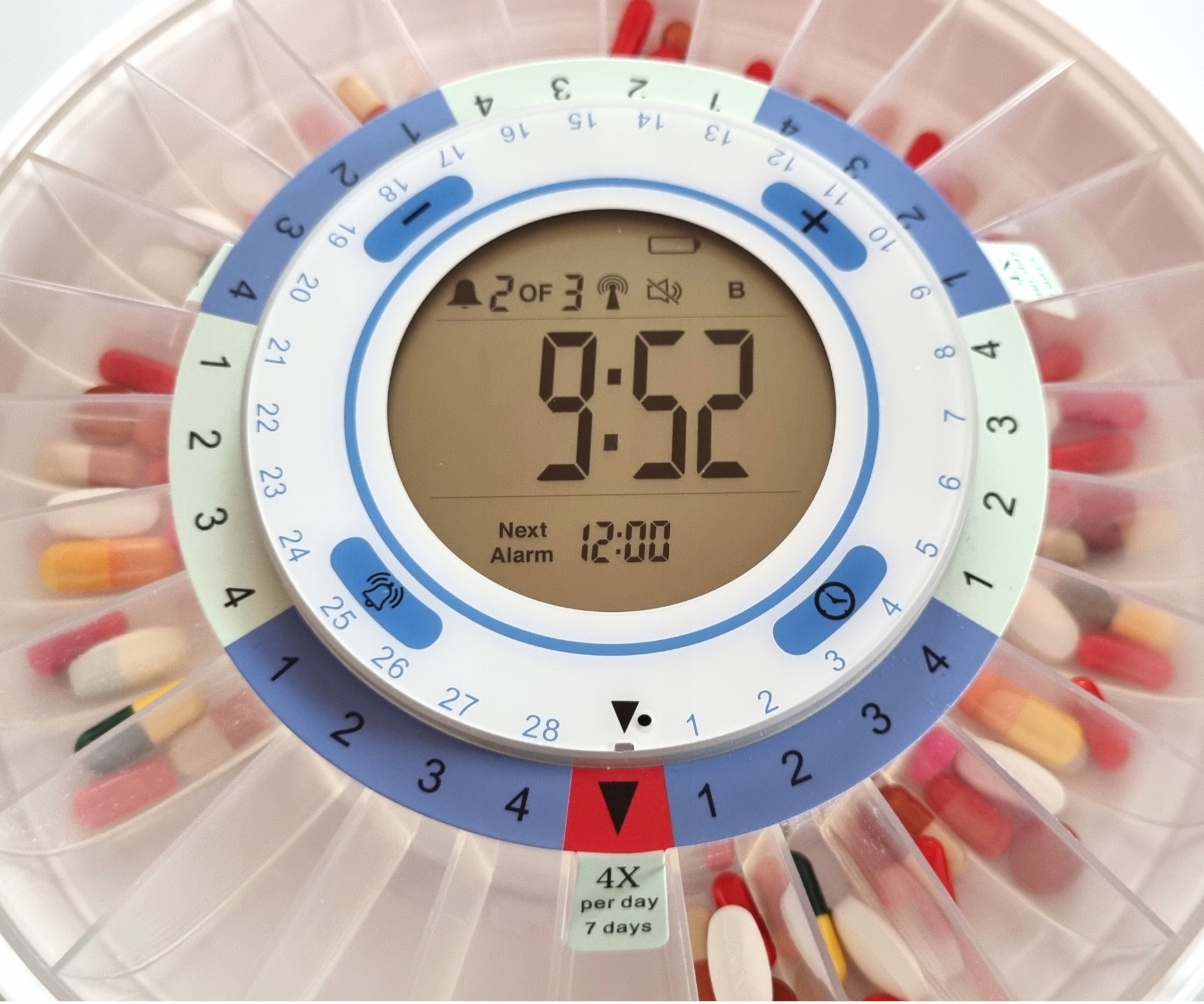 NIEZAWODNE PRZYPOMINANIE O ZBIERANIA LEKARSTW I NIEZAWODNA KONTROLA DAWKOWANIA - kontrolowane czasowo dawkowanie i przypominanie o lekach, witaminach i innych suplementach diety od 1 do 9 razy dziennie poprzez jasne oświetlenie wokół wyświetlacza, sygnalizację dźwiękową (3 poziomy i 3 rodzaje)