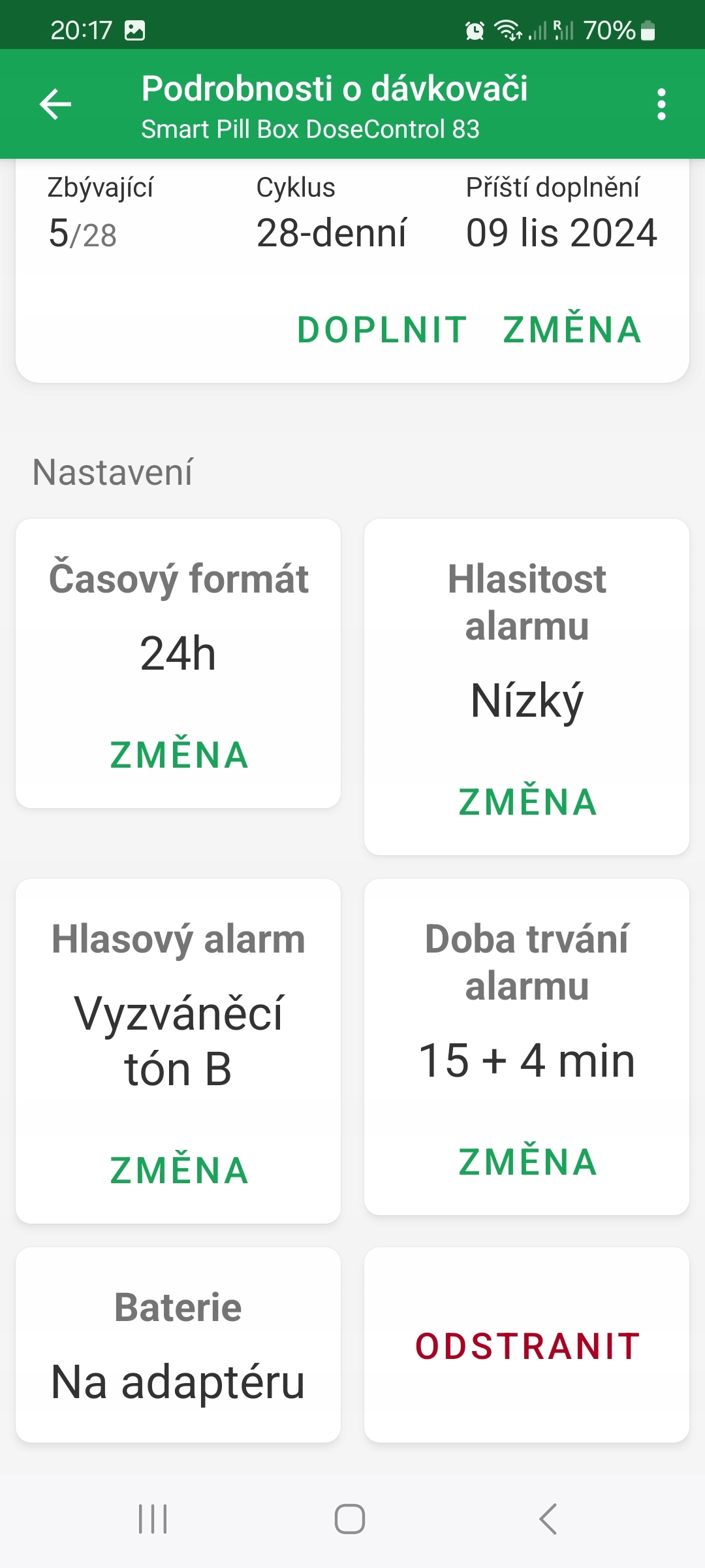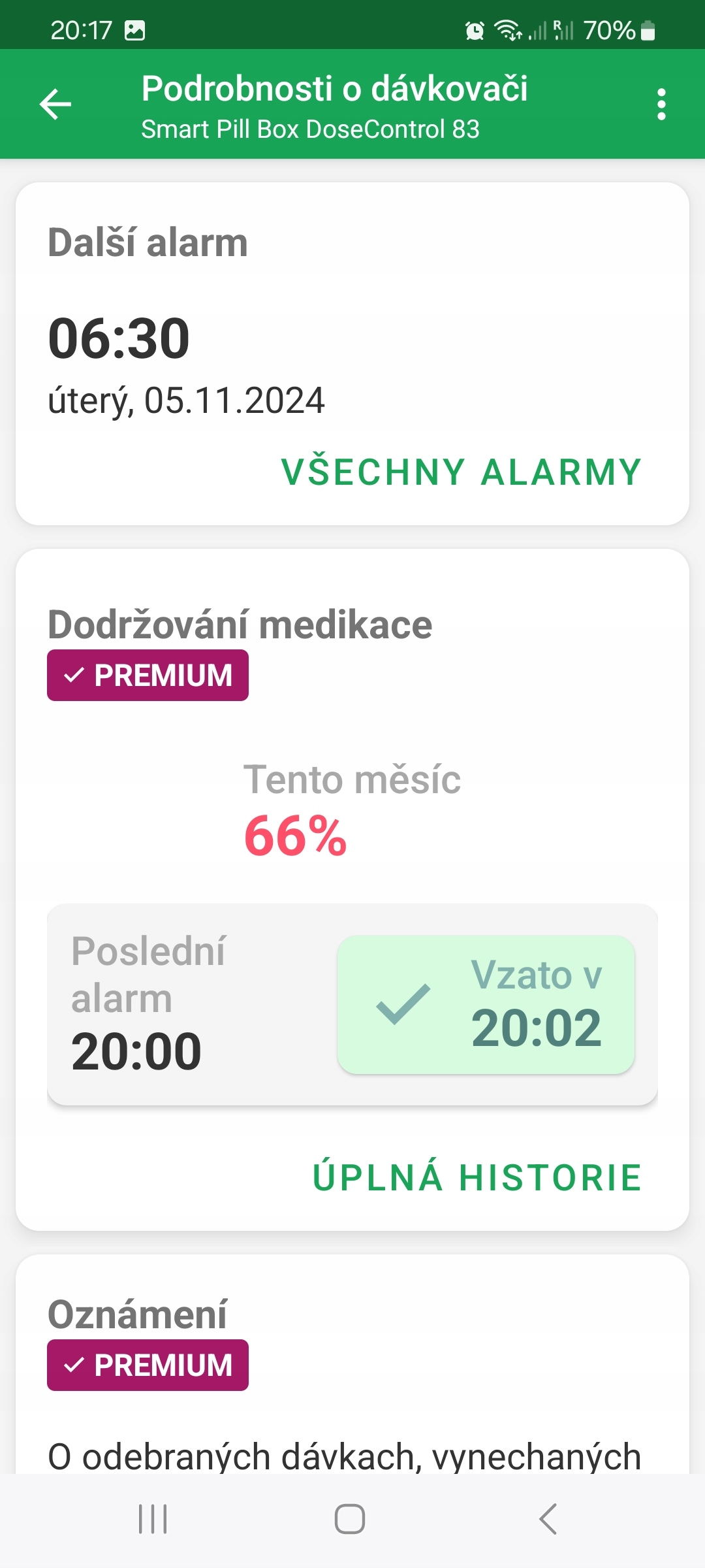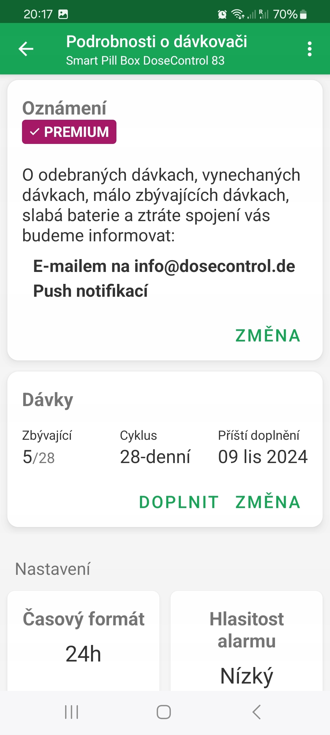 ZDALNE STEROWANIE I MONITOROWANIE DOZOWNIKA PRZEZ WIFI - za pomocą aplikacji na Androida możesz zdalnie sterować ustawieniami dozowników (programowanie bezpośrednio na dozowniku za pomocą przycisków nie jest już konieczne) oraz zdalnie monitorować dozownik (pobrane dawki, pominięte dawki, rozładowane baterie lub brak leków) powiadomień mailowych i wiadomości push na telefon. Zebrane dane o produktach leczniczych są przechowywane w centrum danych należącym do DoseControl.