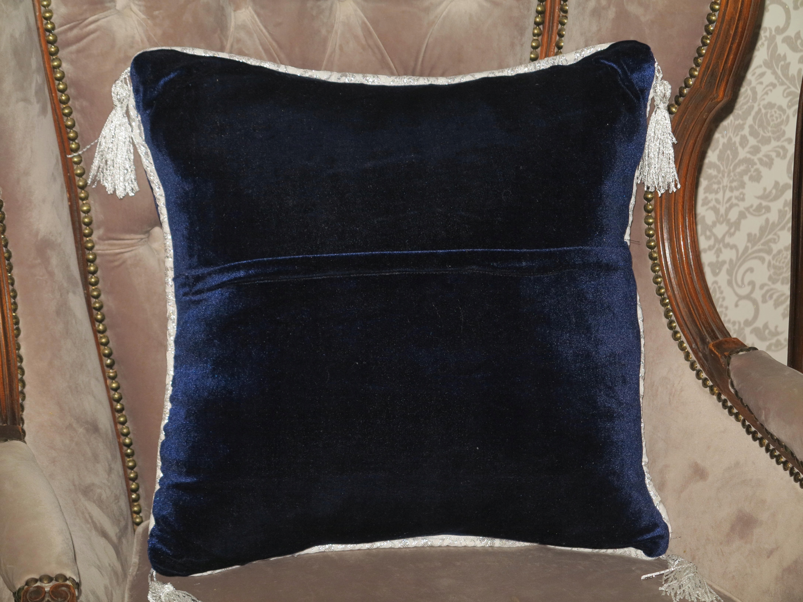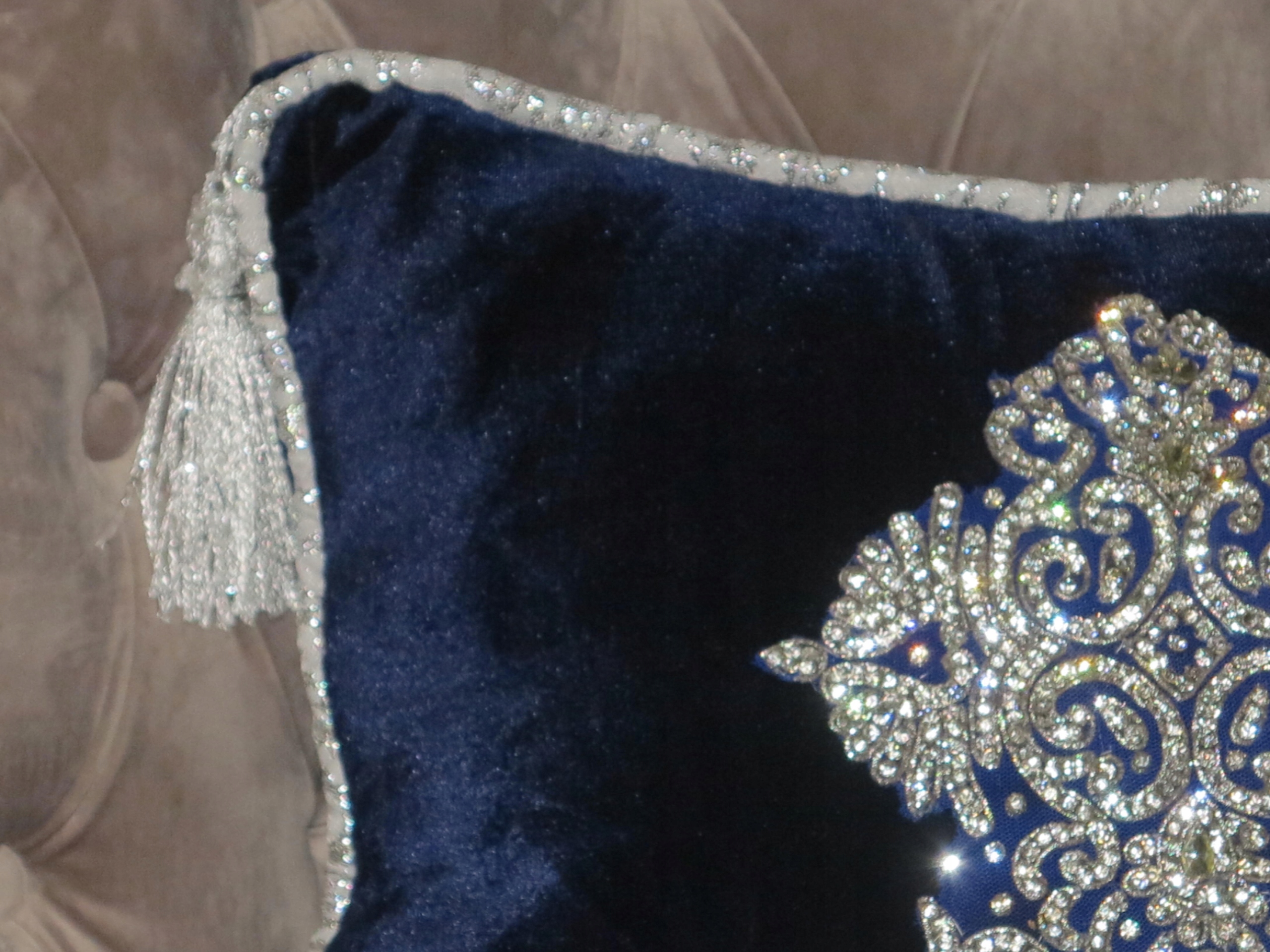 Przedmiotem aukcji jest wyjątkowo piękna aksamitna poduszka w kolorze kobaltowym z wypukłym srebrnym medalionem z cyrkoniami, . Używana, w super dobrym stanie i jakości. Polecam