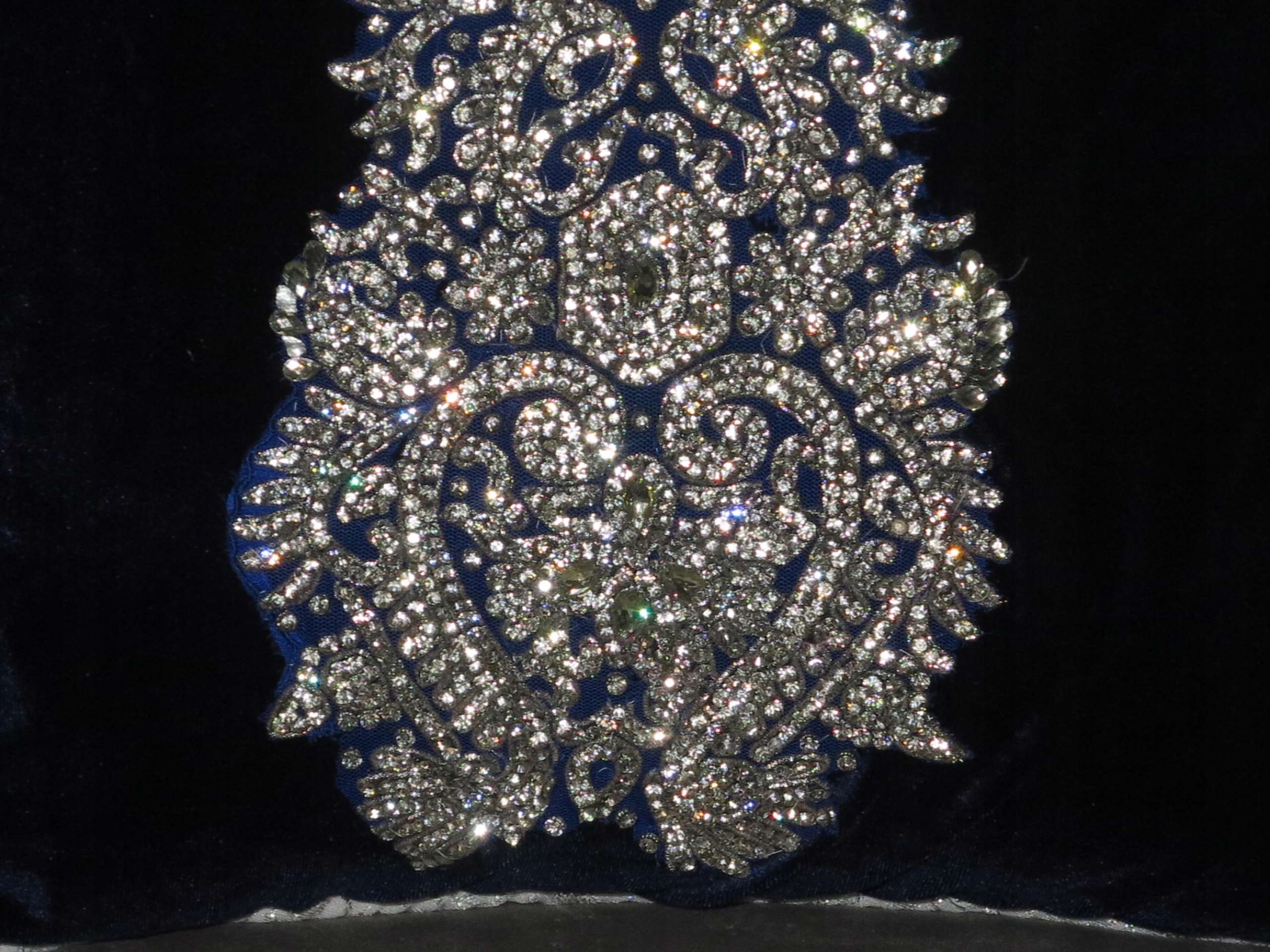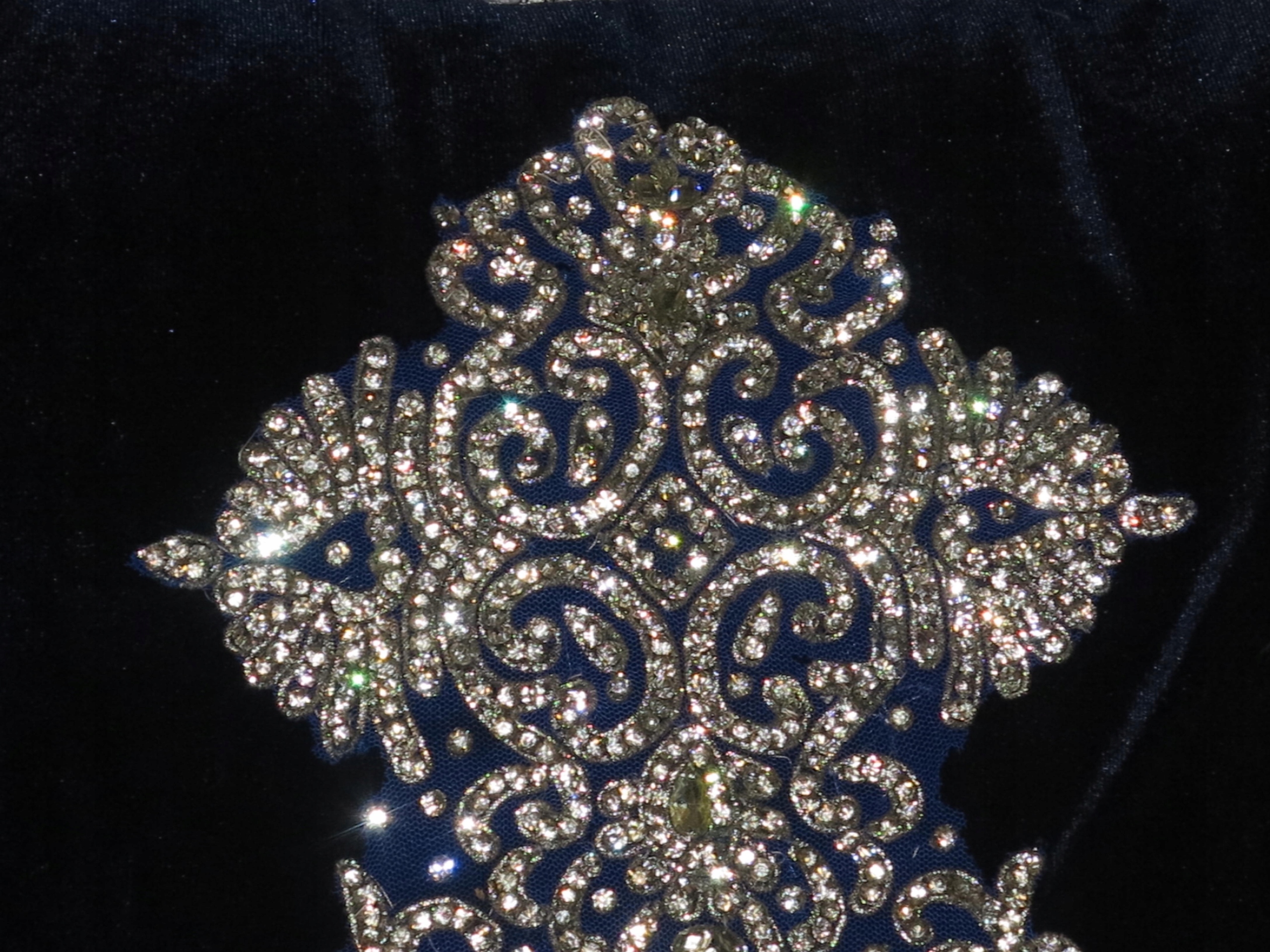 PRZEPIĘKNA AKSAMITNA DUŻA KOBALTOWA PODUCHA ZDOBIONA WYPUKŁYM MEDALIONEM Z WIĘKSZYCH CYRKONII. NA OKOŁO WYKOŃCZONA SREBRNYM WAŁECZKIEM, NA ROGACH SREBRNE CHWOŚCIKI