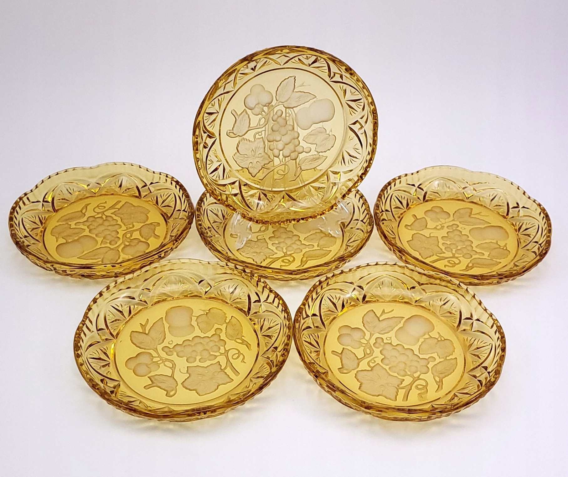 Zestaw sześciu deserowych talerzyków w miodowym kolorze.