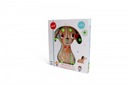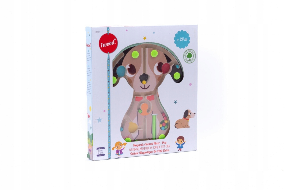 Drewniany labirynt w formie pieska sprawi, że dziecko nie będzie potrafiło oderwać się do tej niezwykle uroczej zabawki. Innowacyjny sposób na naukę kształtów i ćwiczenia ruchów precyzyjnych u dziecka. Za pomocą rysika magnetycznego zawartego w zestawie maluch może próbować przesuwać kuleczki, które znajdują się za przezroczystą szybką i starać się przenosić je do odpowiednich otworów.
