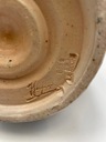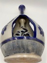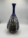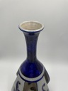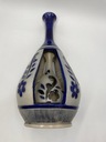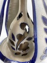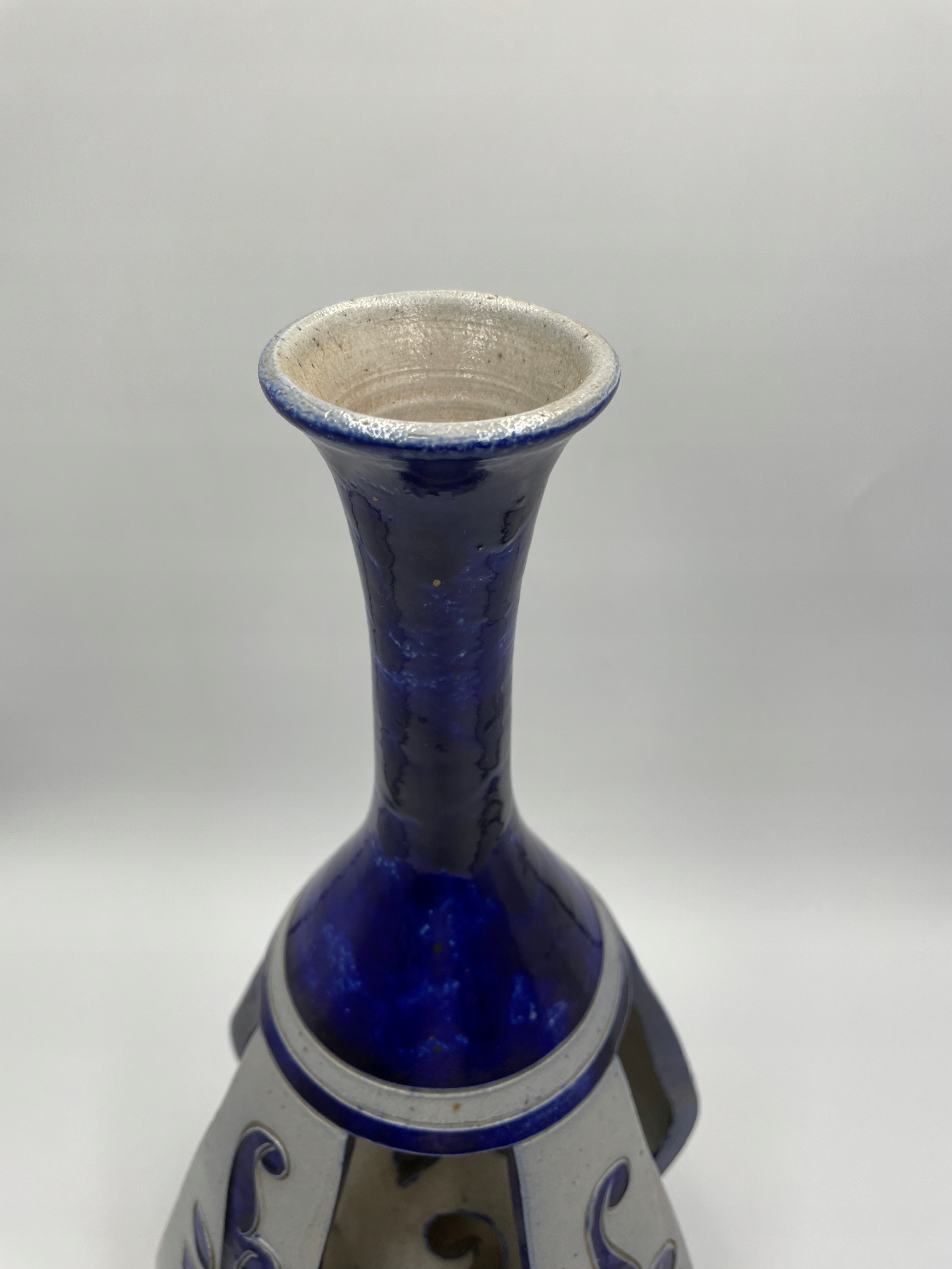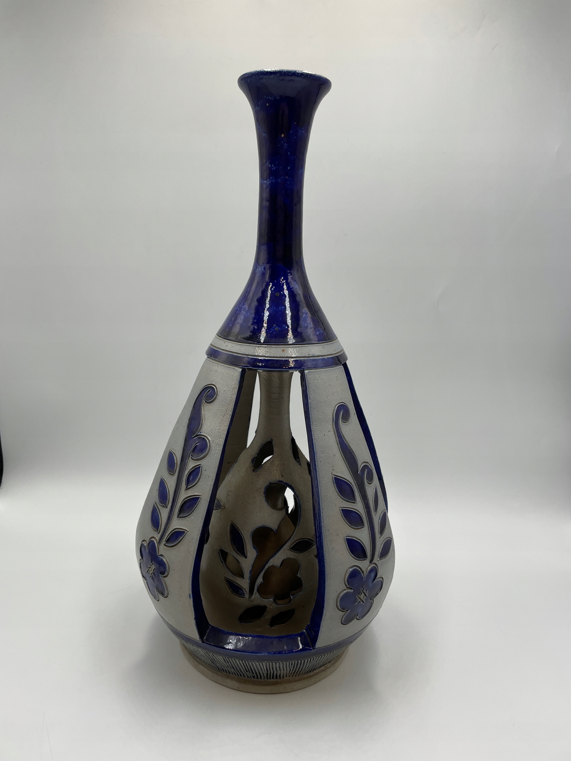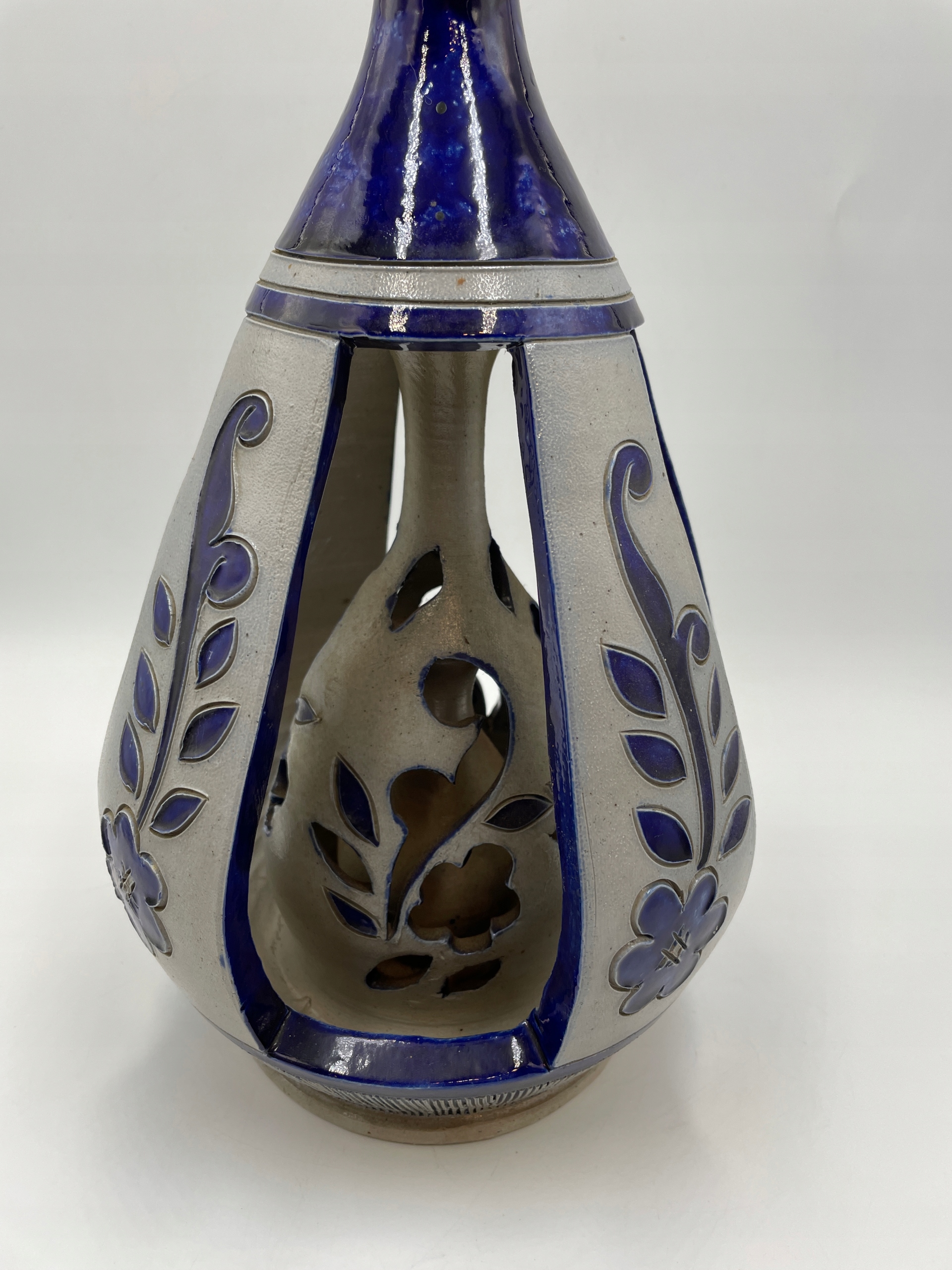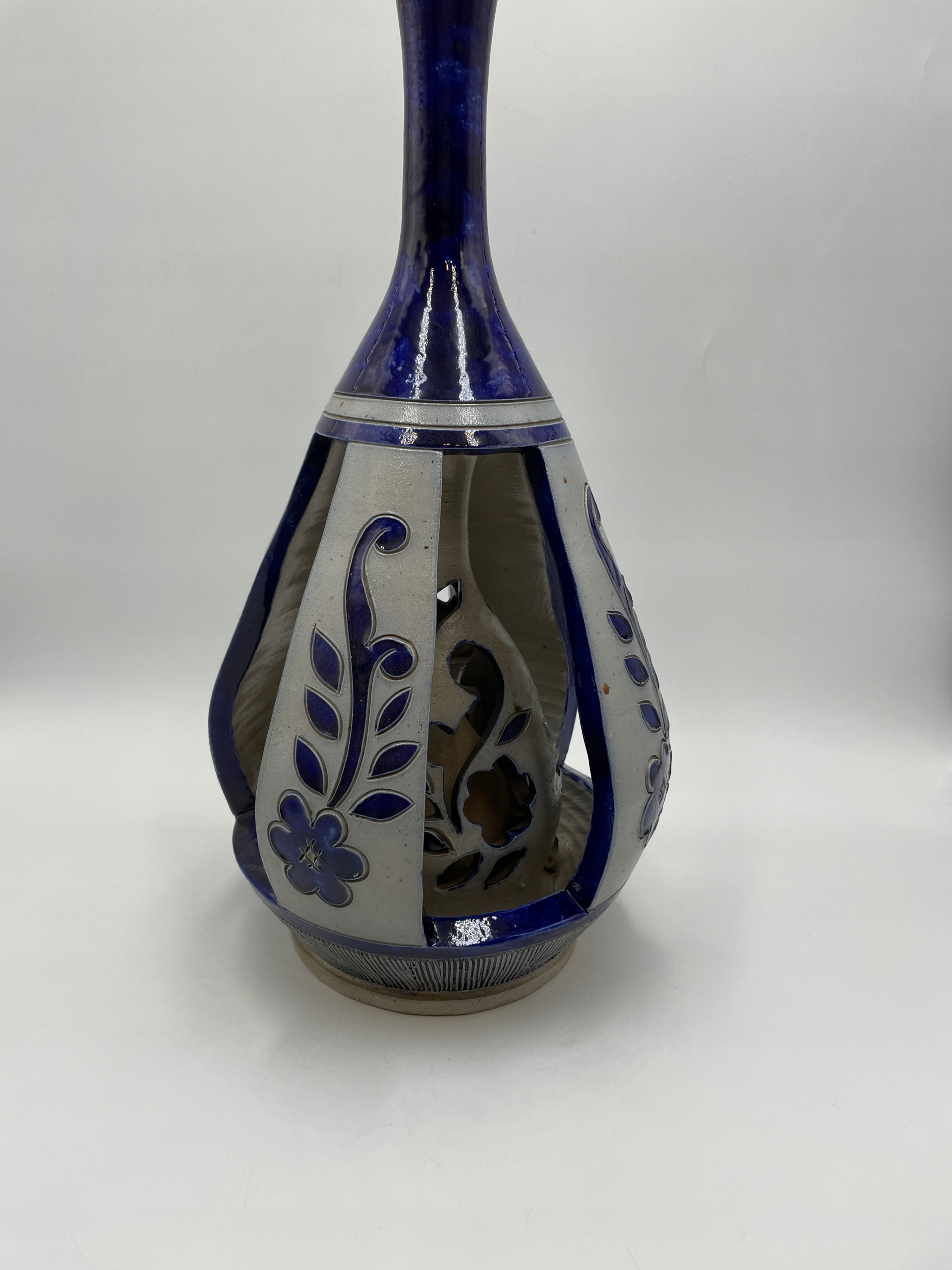 Unikalny ręcznie wykonany ceramiczny wazon z ażurowymi wzorami i podwójnymi ściankami. Wykonany w eleganckiej kombinacji intensywnego koloru niebieskiego i naturalnej ceramiki. Zewnętrzne ściany wazonu ozdobione są florystycznym ornamentem i misternymi ażurowymi wzorami, odsłaniającymi wewnętrzną warstwę dekoracji. Efektowna forma i artystyczne wykonanie czynią ten wazon wytworną dekoracją wnętrza lub cennym prezentem dla kolekcjonerów. Na spodzie wazonu znajduje się sygnatura i podpis mistrza „Haegeman”, potwierdzający pochodzenie wyrobu ze znanej belgijskiej pracowni. Wymiary: wysokość – 37 cm, średnica – 18 cm.
