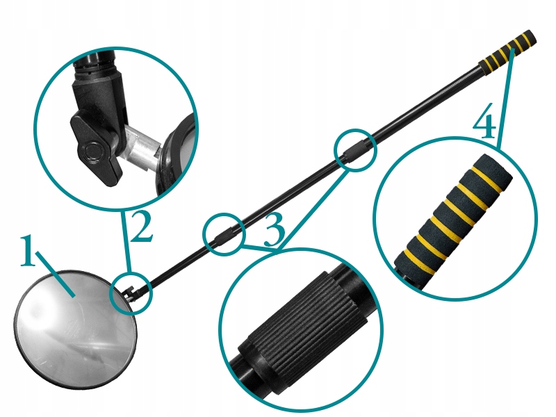 Ramię lustra wykonano z aluminium w kolorze czarnym, a na zakończeniu znajduje się wygodna piankowa rączka, regulowane jest w zakresie 60-110cm.