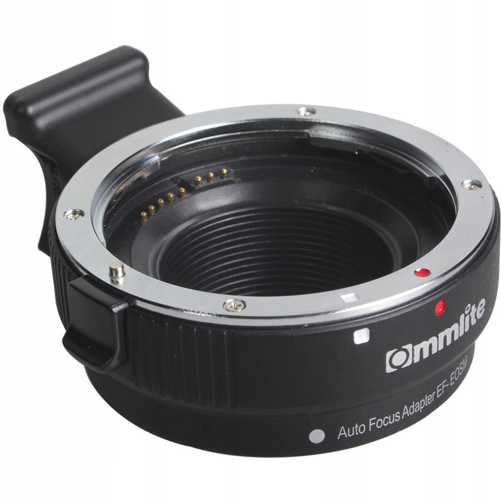 Adapter bagnetowy Commlite Canon EF - Canon EF-M z przeniesieniem elektroniki obiektywu. Kompatybilny z obiektywami systemu Canon EOS EF/EF-S i korpusami Canon EF-M (EOS M).