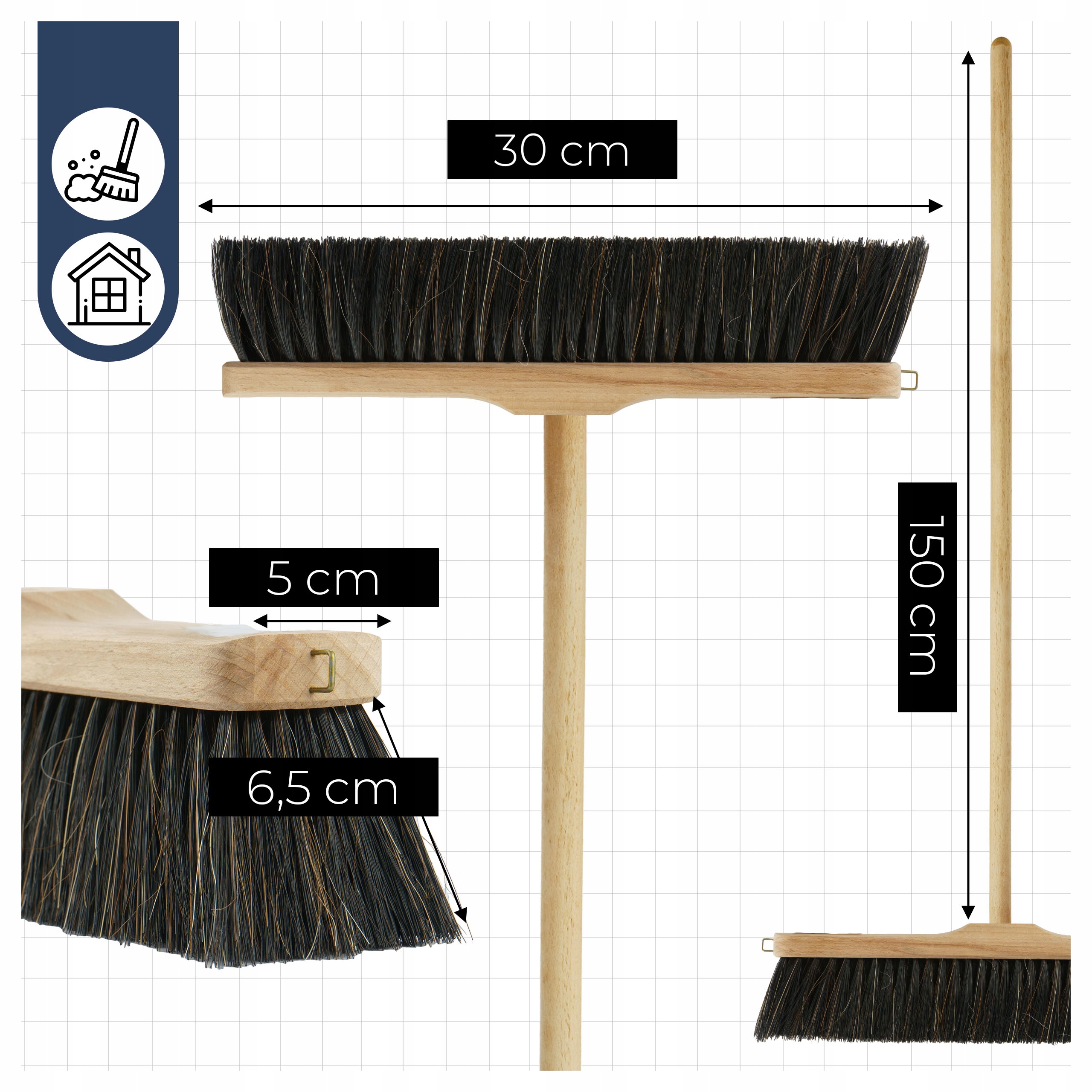 ⬅️Wytrzymała miotła drewniana o szerokości 30 cm z długim trzonkiem to doskonałe narzędzie do codziennego sprzątania. Dzięki mieszanemu włosiu (naturalnemu i syntetycznemu) skutecznie usuwa zarówno drobne, jak i większe zabrudzenia. Solidna drewniana oprawa oraz długi kij 150 cm zapewniają wygodę i trwałość użytkowania.