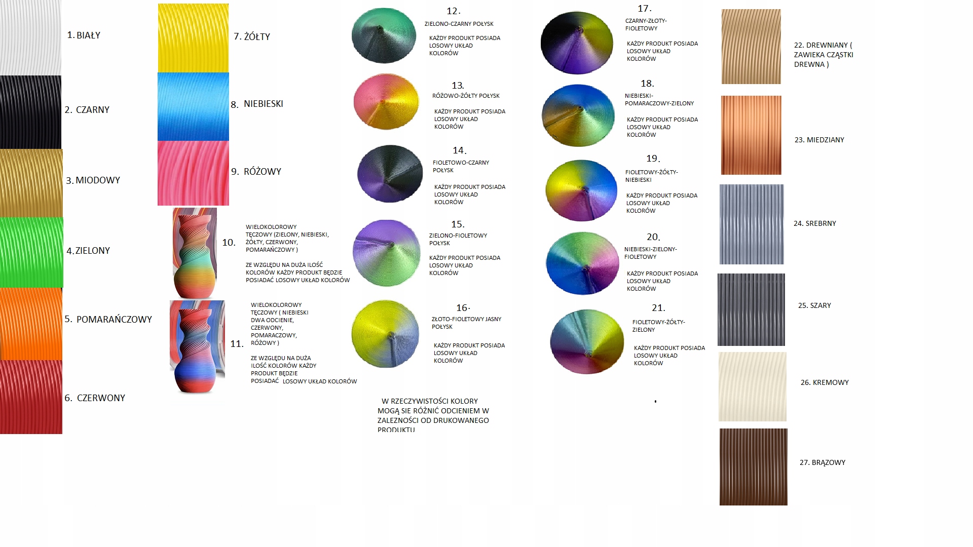 Przedmiot drukowany z naszej palety kolorów. Użyty został materiał trójbarwny. Kolory przeplatają się wzajemnie tworząc unikalne wzory kolorystyczne. Każdy produkt będzie miał inny układ, a także inne rozmieszczenie kolorów. Chcesz unikatowy wyrób? Wybierz z naszej palety kolorów barwy tęczowe lub trzykolorowe, a otrzymasz niepowtarzalny produkt.