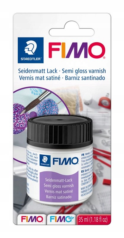Właściwości: - Warstwa lakieru sprawia, że kolory wyglądają intensywniej a struktura jest bardziej widoczna; - Po wysuszeniu jest przezroczysty i daje wysoką odporność na zarysowania; - Wysycha powierzchniowo po 20 min., całkowicie po 24 godzinach; - Polecany do FIMO professional, FIMO soft i FIMO air.