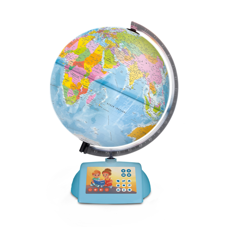 Globus znany był już w starożytności. Stworzył go genialny matematyk, fizyk i astronom – Archimedes. Powstające przez wieki globusy stawały się coraz dokładniejsze. Globus, który masz przed sobą, doskonale odzwierciedla mapę świata, a do tego potrafi mówić. Archimedes z pewnością byłby zaskoczony! Wiadomości zawarte w globusie można usłyszeć dzięki mówiącemu pióru Albik, które odczyta wiele informacji i ciekawostek o prawie 200 krajach świata. Firma Tecnodidattica zaprojektowała ten globus ze specjalistami w dziedzinie geografii. Dzięki temu dane zawarte w oprogramowaniu są możliwie najdokładniejsze i najaktualniejsze. Z pomocą interaktywnego globusa dzieci poznają wszystkie kraje i ich stolice. Usłyszą hymny i liczne ciekawostki. Dzięki quizom będą się świetnie bawić i utrwalać wiedzę.