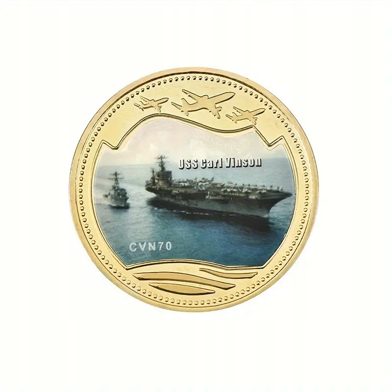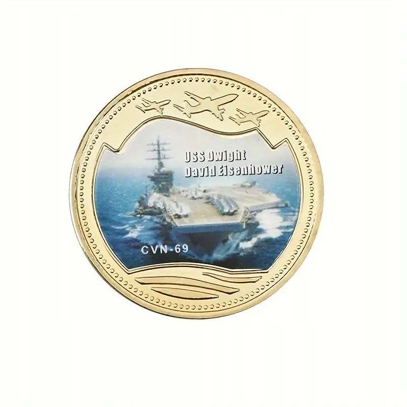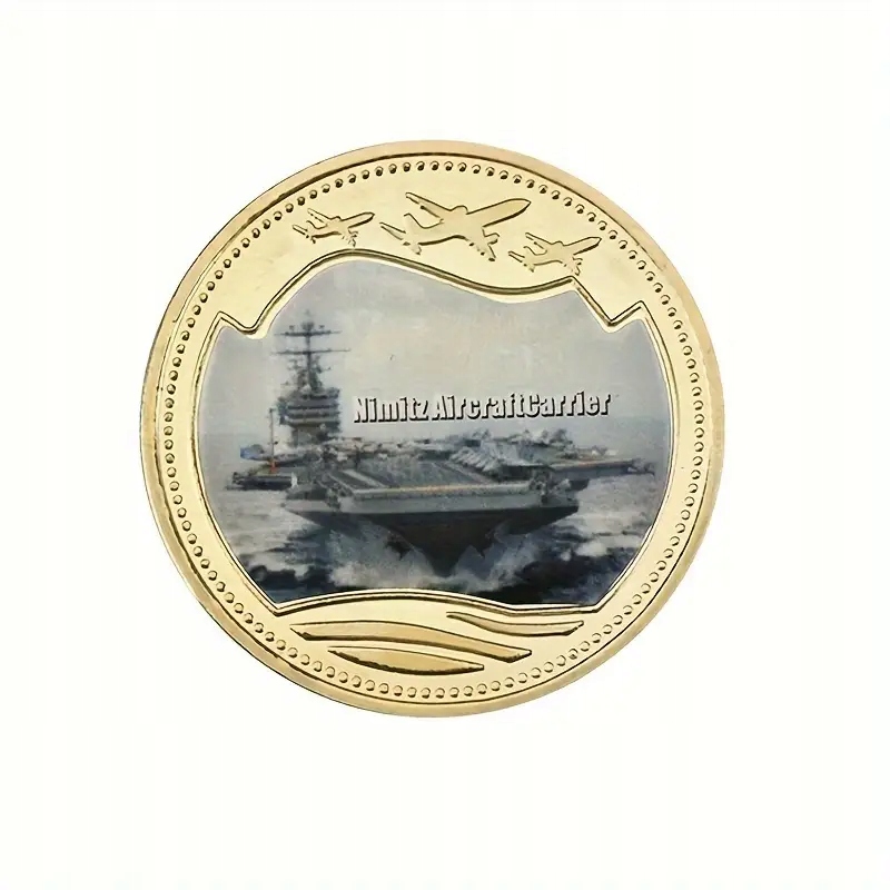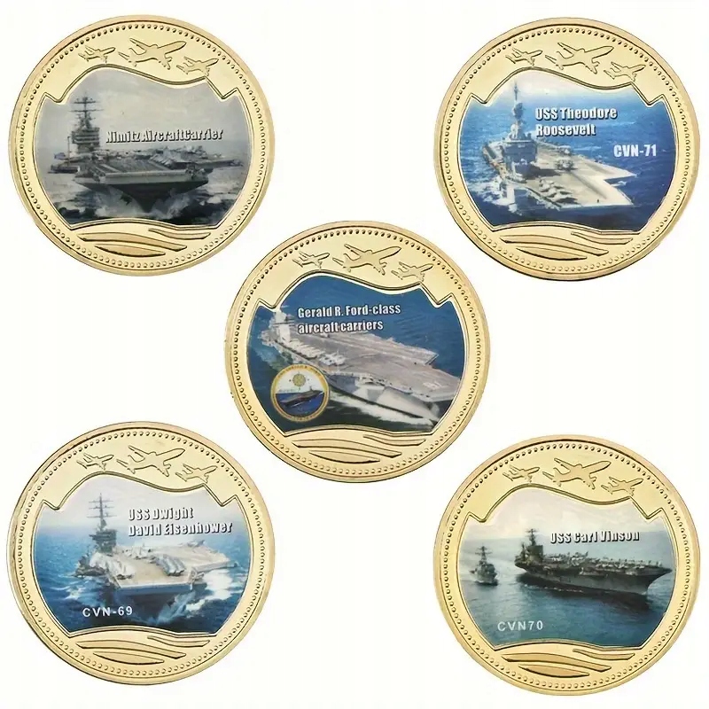 ☑️Monety są okrągłe, ze złotymi obramowaniami, a na ich awersie widnieją wizerunki lotniskowców wraz z ich nazwami i numerami kadłubowymi (tam gdzie są dostępne).