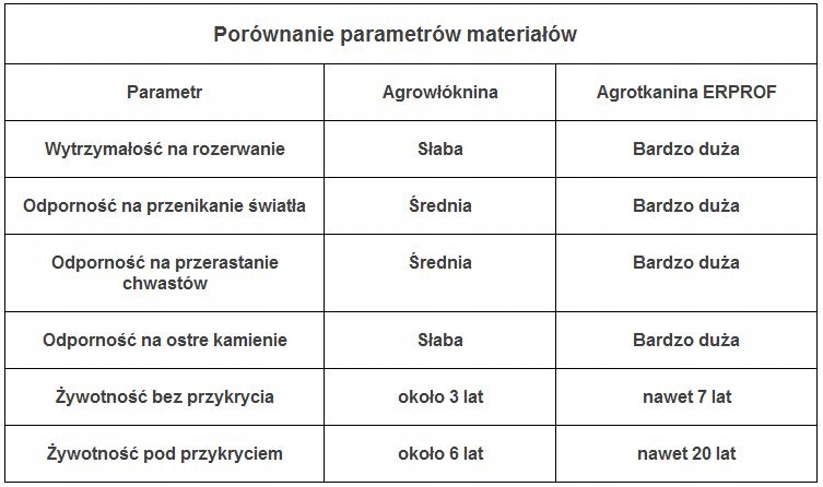 Żywotność agrotkaniny ERPROF jest 2 krotnie dłuższa niż agrowłóknin na słońcu a pod przykryciem sięga nawet 20 lat w zależności od gramatury.