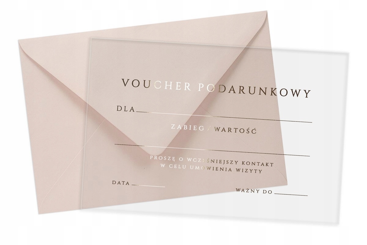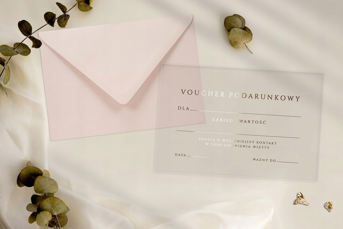 1) Voucher z nadrukiem kolorowym wraz ze złoconym tekstem