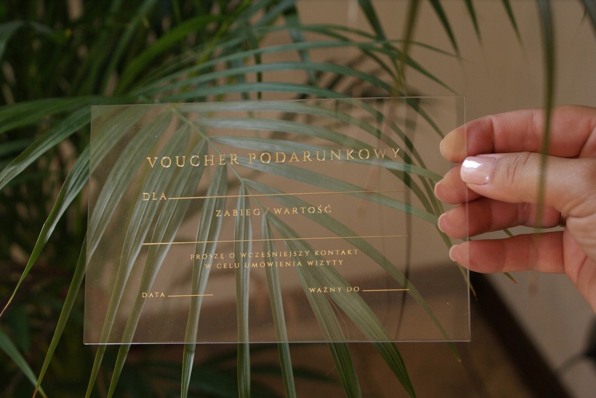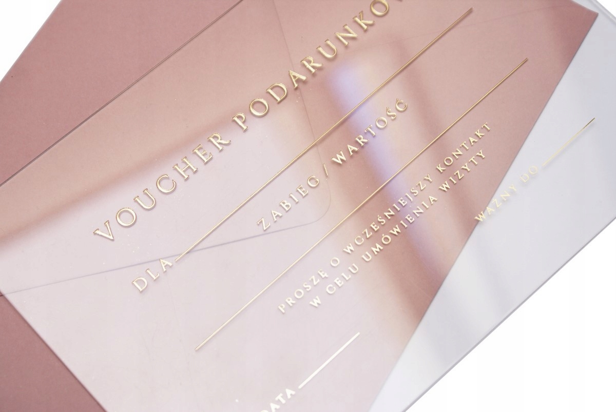 Voucher uszlachetniony folią złotą wykonany metodą hotstampnigu. Tekst jest złocony i jednocześnie tłoczony.