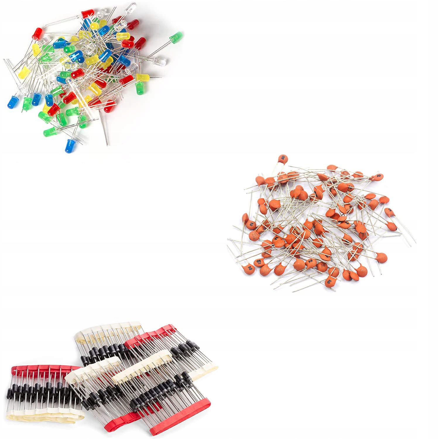 12 rodzajów kondensatorów elektrolitycznych, 30 rodzajów kondensatorów ceramicznych, 8 rodzajów zwykłych diod, 5 rodzajów diod LED, 8 rodzajów tranzystorów, 30 rodzajów rezystancji folii metalowej. Każdy rodzaj jest zapakowany w plastikową torbę.