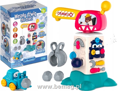 Wesoły dźwig posiada cztery funkcjonalne strony i wiele ruchomych elementów. Kolorowe światełka i bogata liczba dźwięków. Kolorowe światełka i bogata liczba dźwięków, zapewniają świetną rozrywkę na długie godziny i zmieniają każdy nudny salon, w prawdziwy plac budowy! Poprawia motorykę, rozwija wyobraźnię, ćwiczy paluszki, trenuje koordynację wzrokowo - ruchową.