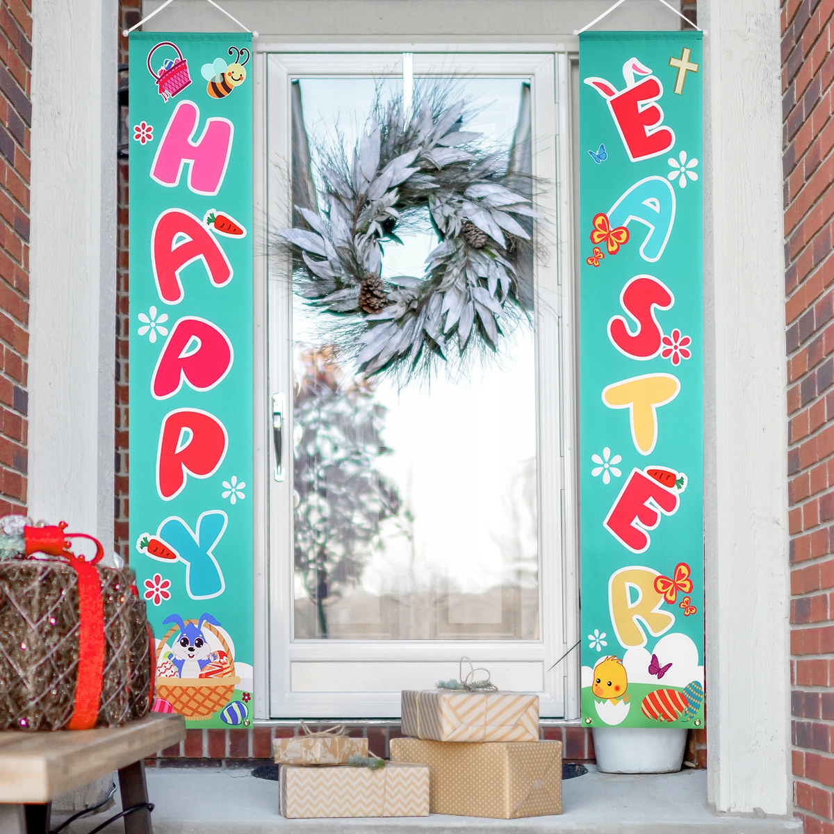 ✅że nie chcesz zostawiać żadnej z was dekoracji przestrzeni domowej na przyjęcie wielkanocne, bez wyjątku od werandy lub drzwi. Nasz znak ganku to doskonała dekoracja dla Ciebie, z jasnymi kolorami i wzorem Happy Easter words w banerze, łatwa do stworzenia szczęśliwej świątecznej atmosfery na imprezę.