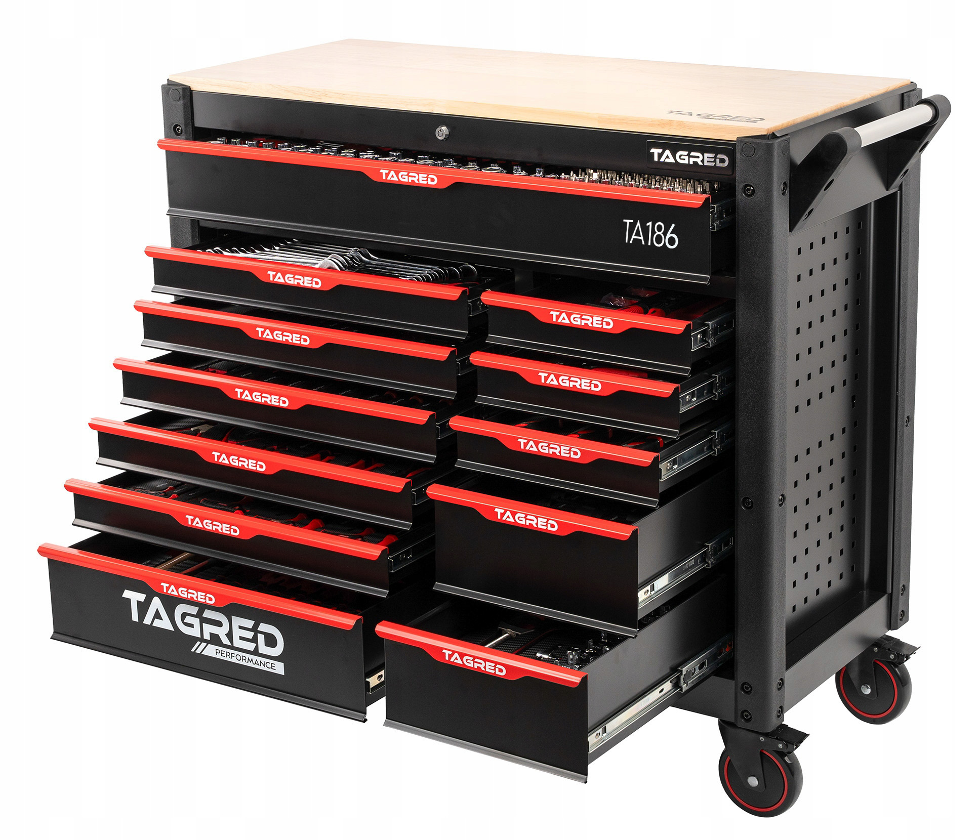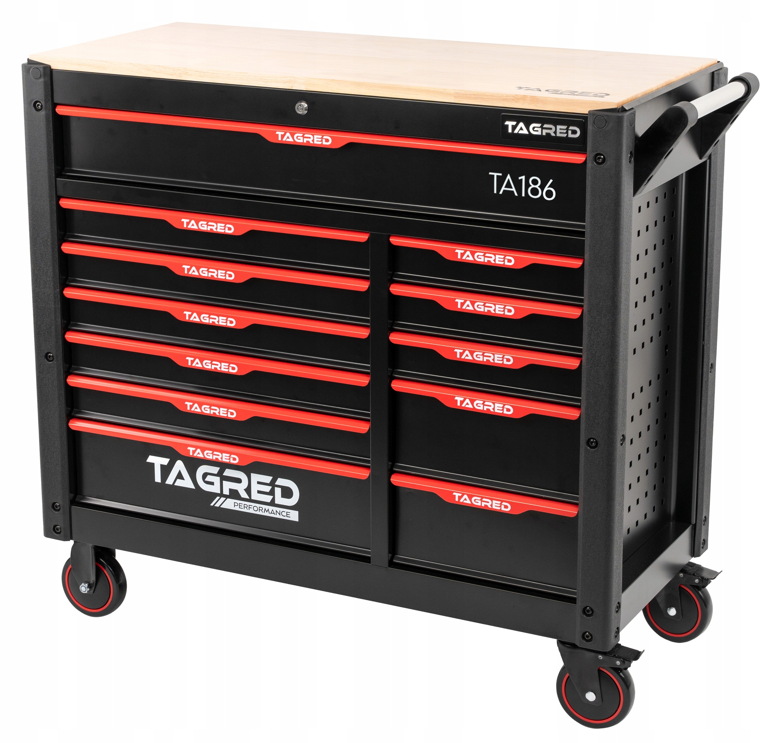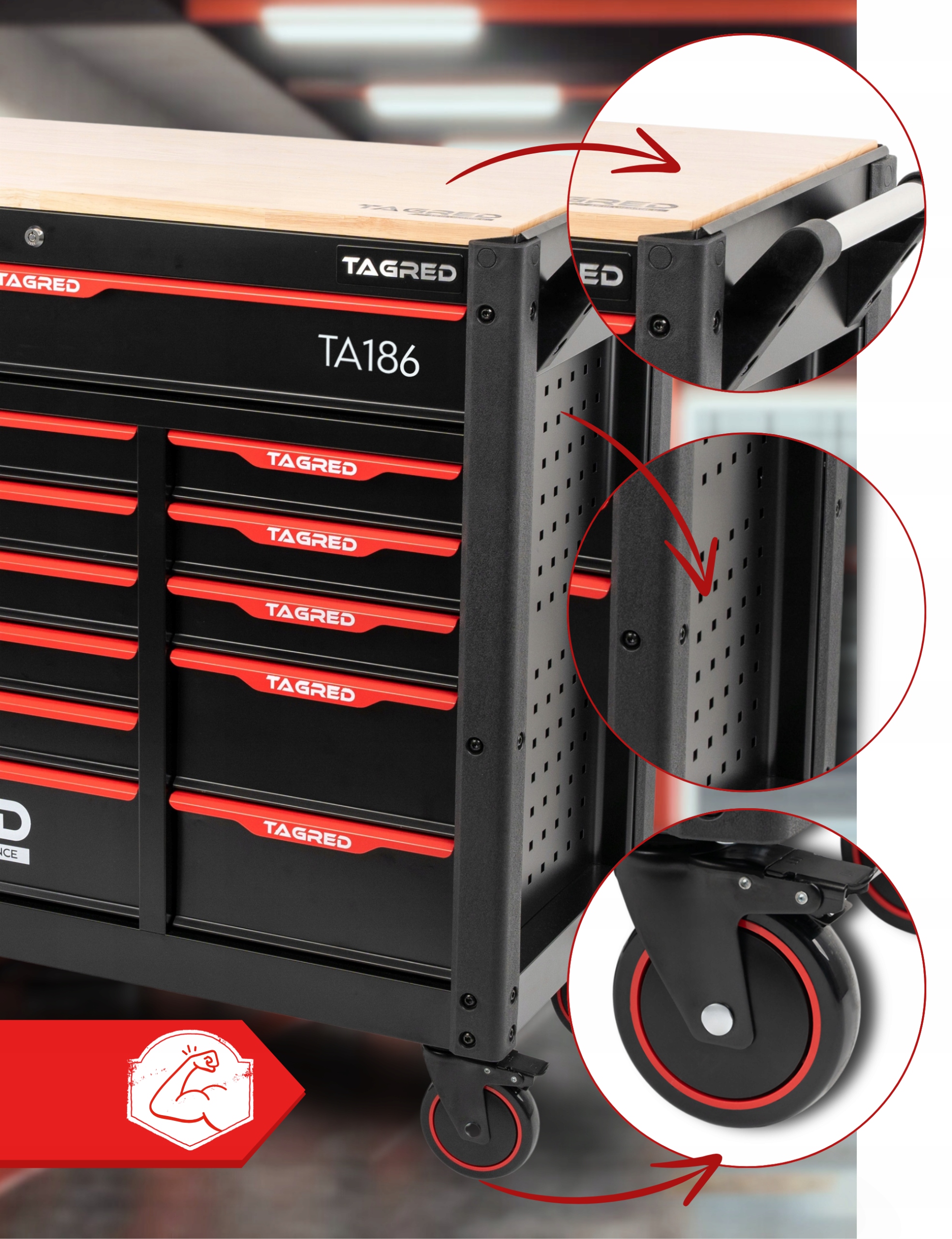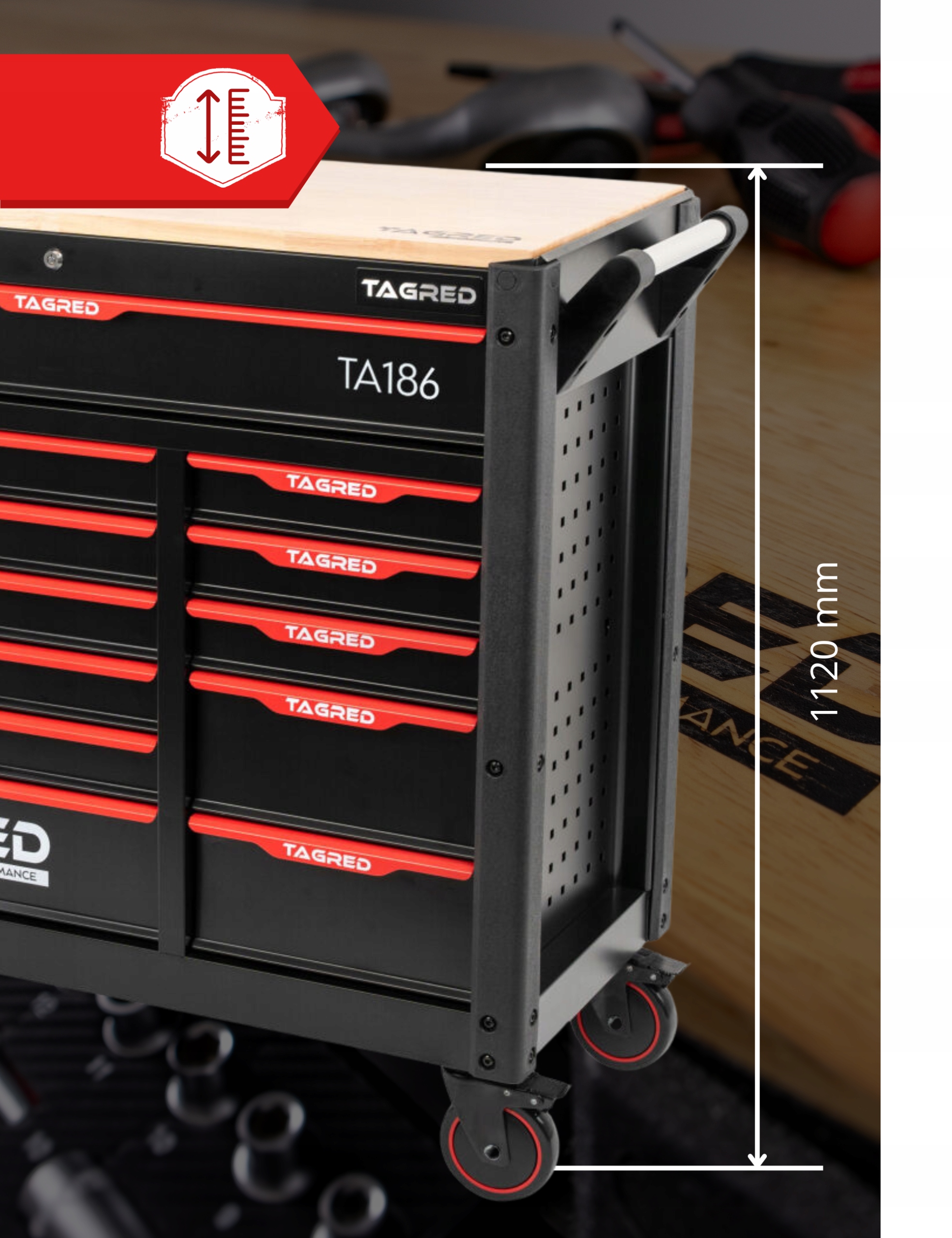 Wózek warsztatowy TA186 to wytrzymałość, funkcjonalność i wygoda. Wykonany ze stali 0,8 mm, zapewnia trwałość w każdych warunkach. 12 szuflad na łożyskach kulkowych z automatycznym domykaniem i centralnym zamkiem zabezpiecza narzędzia. Duże koła z hamulcem oraz ergonomiczny uchwyt ułatwiają transport. Bogate wyposażenie, perforowane ściany na uchwyty i wyściółka EVA chroniąca przed olejami to idealne rozwiązanie dla profesjonalistów i majsterkowiczów.